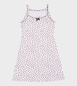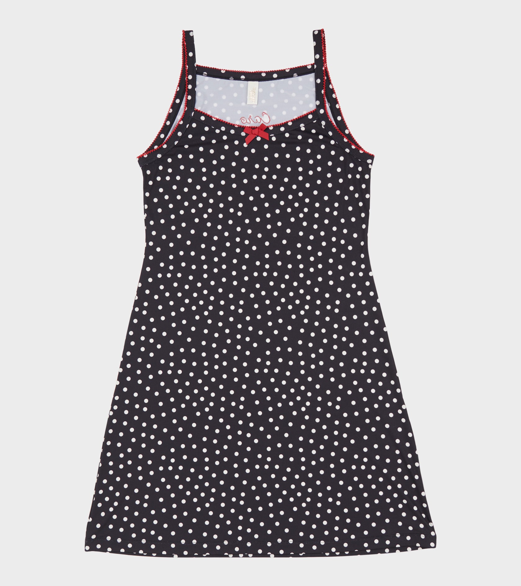 Short black dress with white dots and red details from Caro Editions. Slip Dress Black Dots is made of a stretchy polyester quality and has thin straps and red wavy contrast edges. At the top of the front is a small red bow. At the top of the back is 'Caro' embroidered in red.