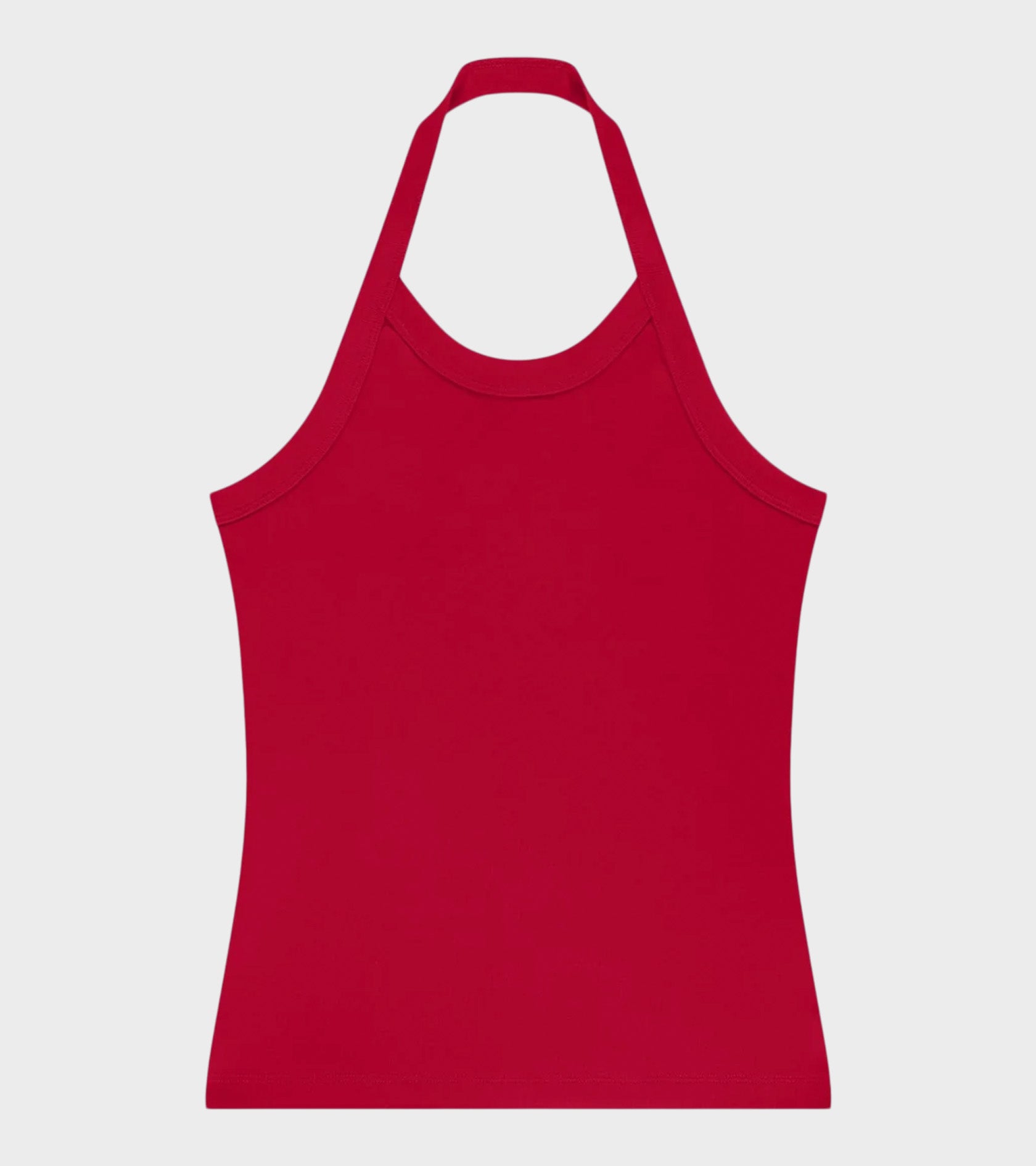 Red halterneck top from Flore Flore. Angie Tank is made of organic cotton.