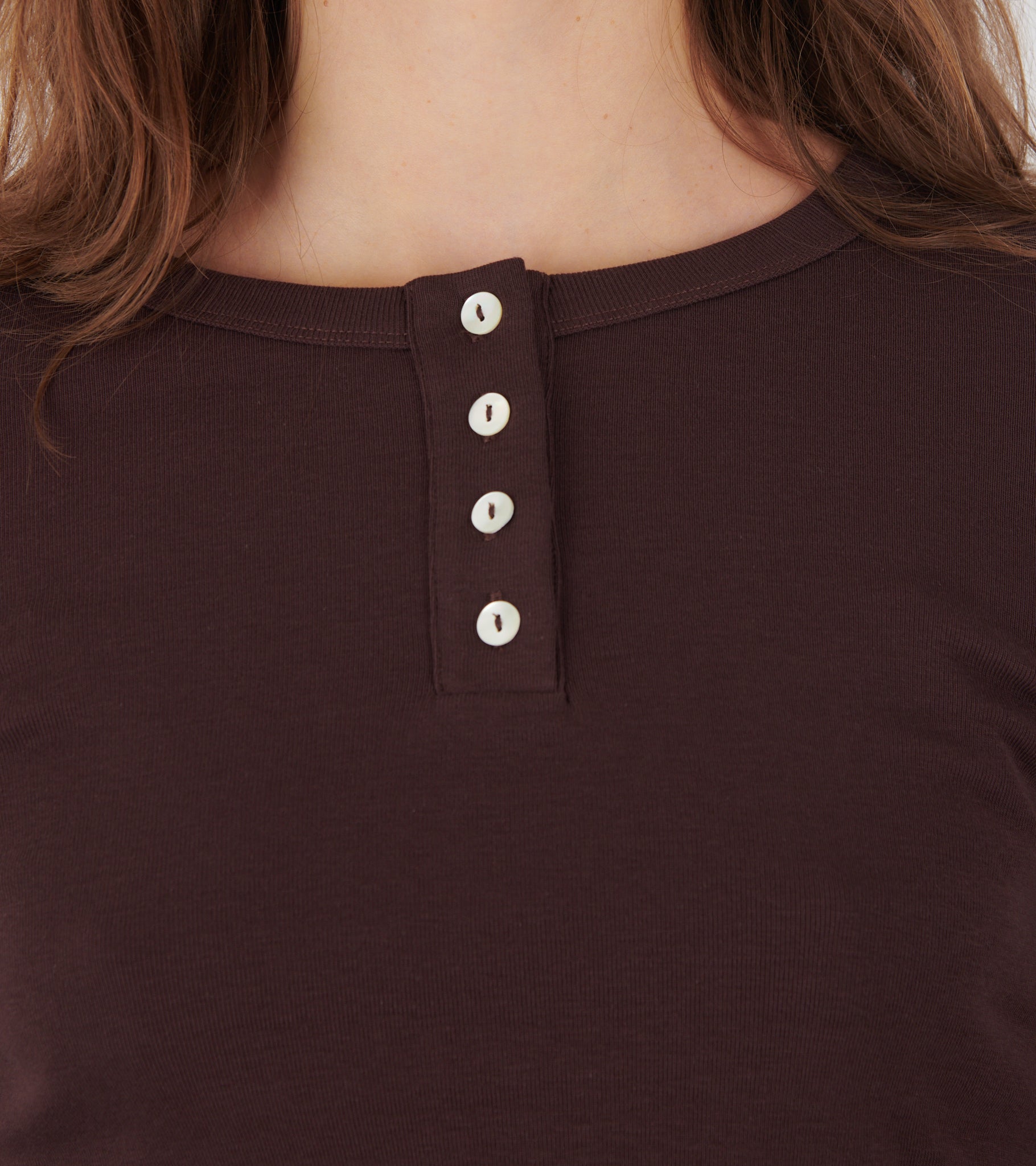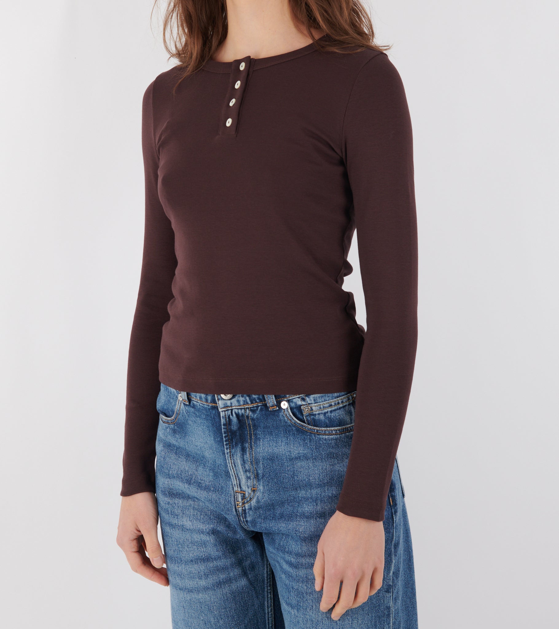 Long-sleeved t-shirt in a dark plum/brown shade from Flore Flore. Jess Longsleeve is made of organic cotton rib and has a round neck and a button closure with four mother-of-pearl buttons.