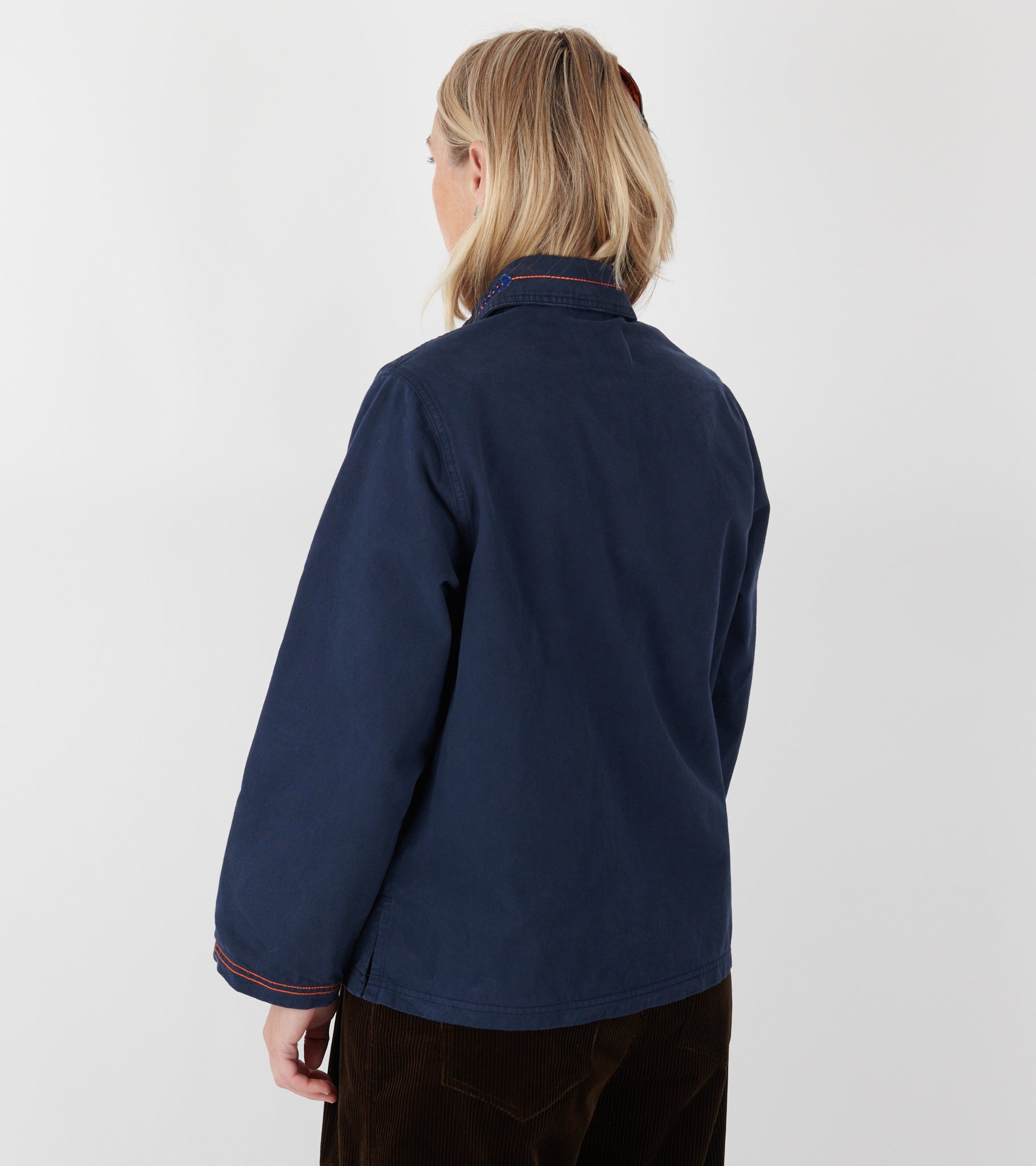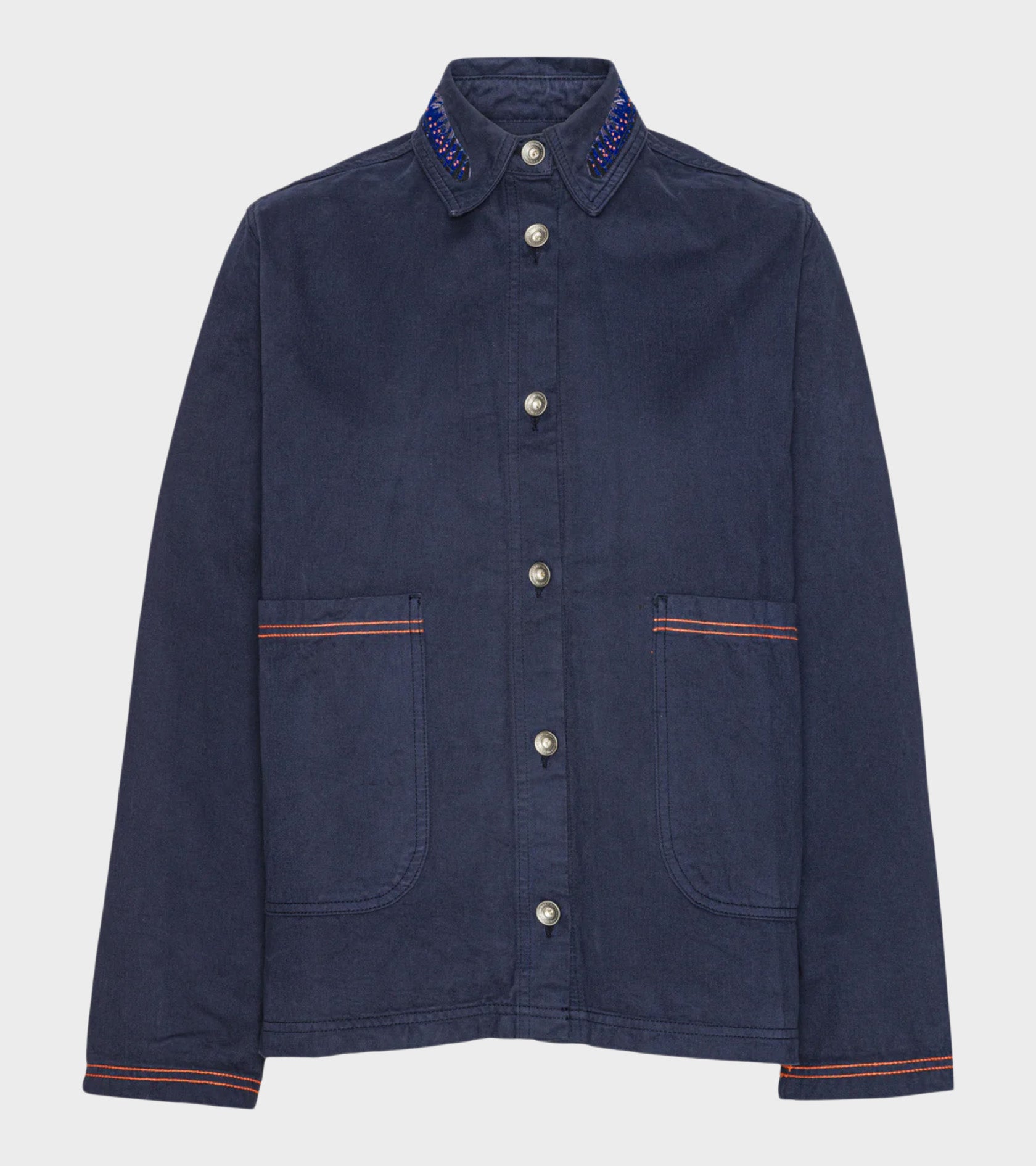 Navy overshirt in organic cotton canvas from Henrik Vibskov. The Wheel Work Shirt has a classic collar, a button closure and two pockets on the front. It is detailed with orange stitchings and a embroidered feather on the collar.