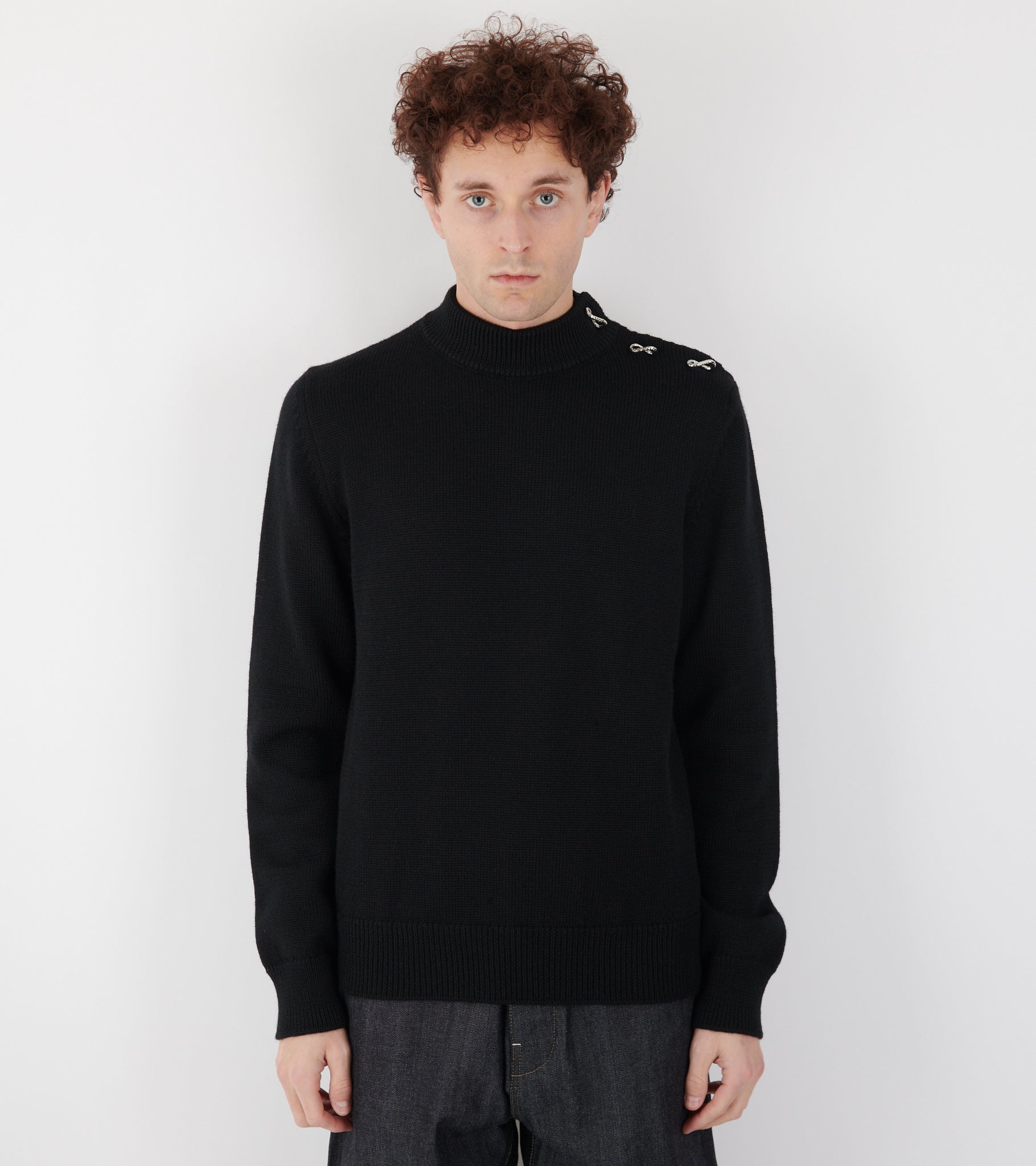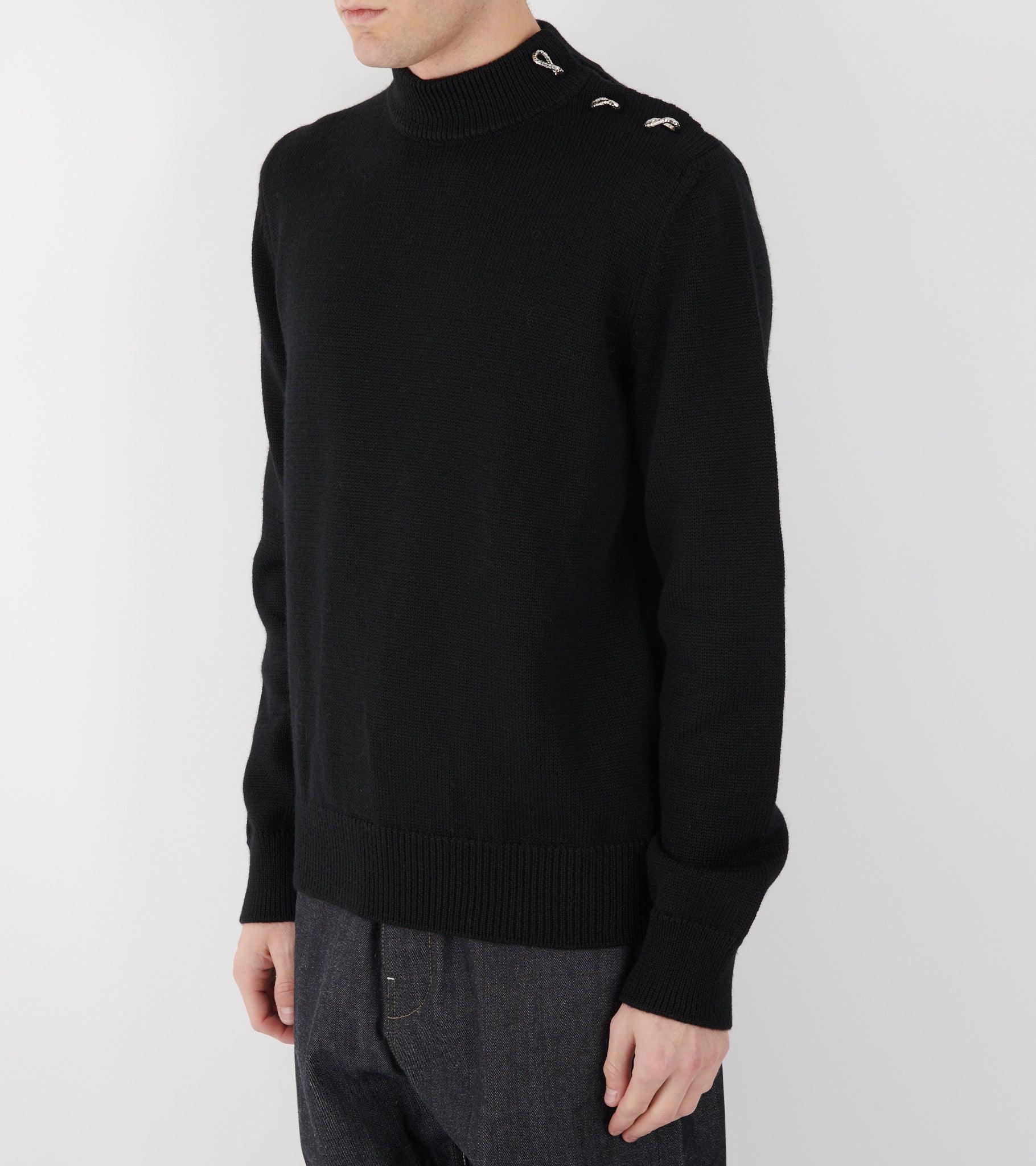 Black knit in heavy virgin wool from Jil Sander. The knit has a mid-high neck and a button closure with three beaten and twisted silver rings on one shoulder.