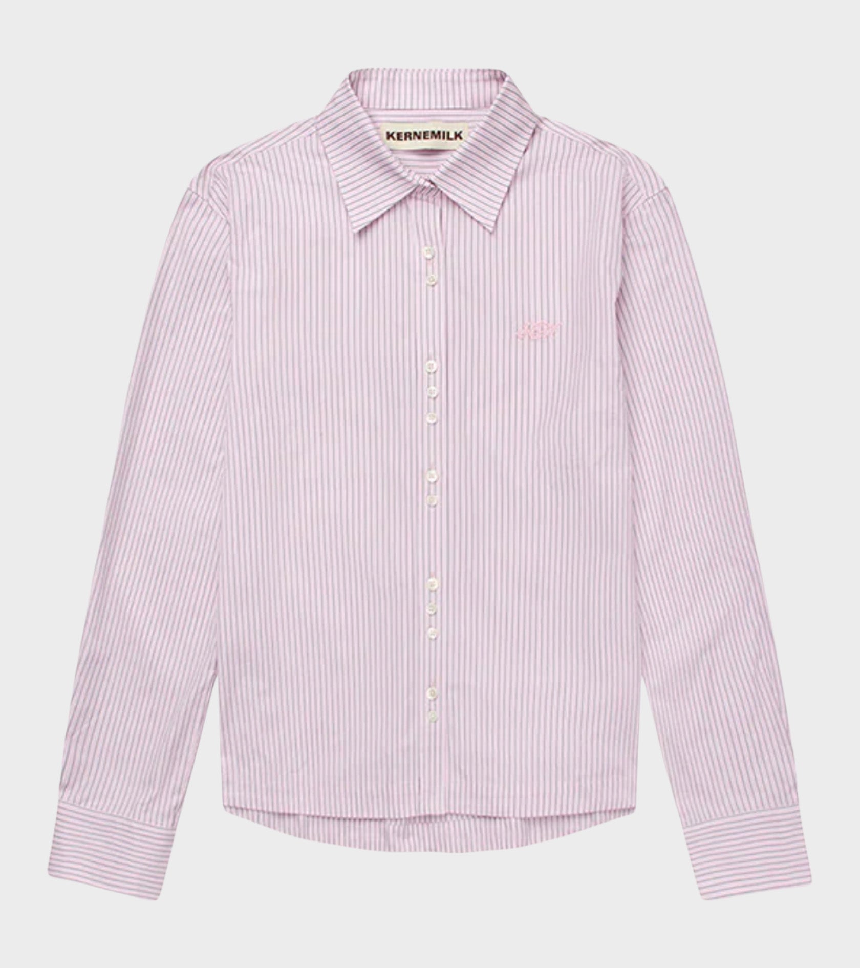 Alexandra Shirt in light pink with stripes from Kernemilk. The shirt features a classic collar, pleats at the back and an asymmetrical button closure at the front. An embroidered logo is placed by the left chest.