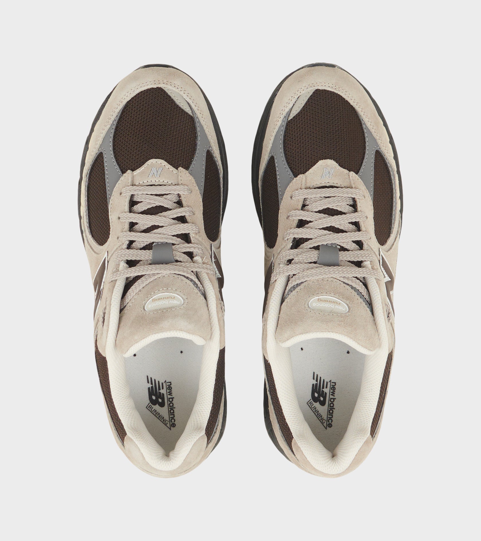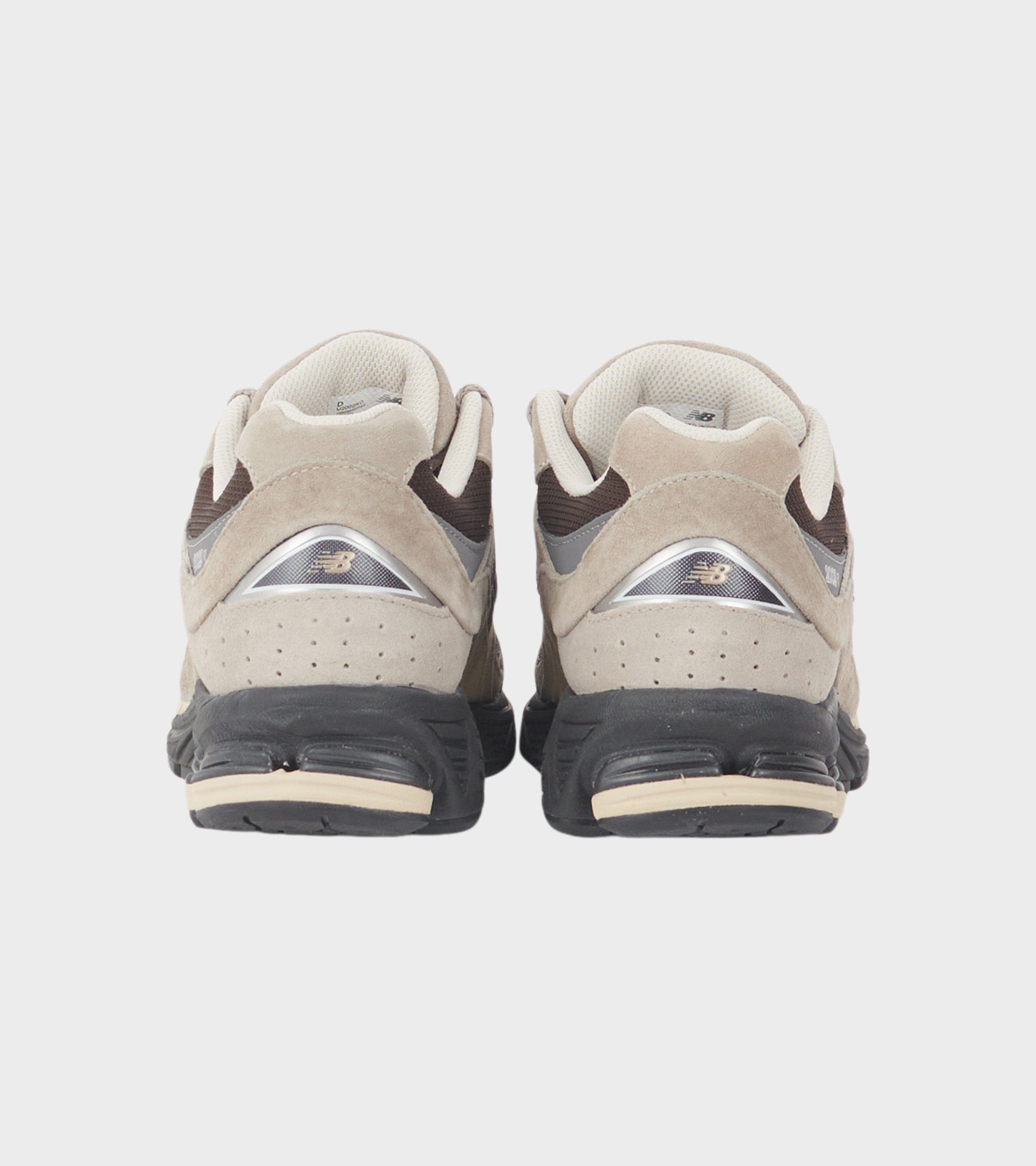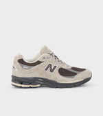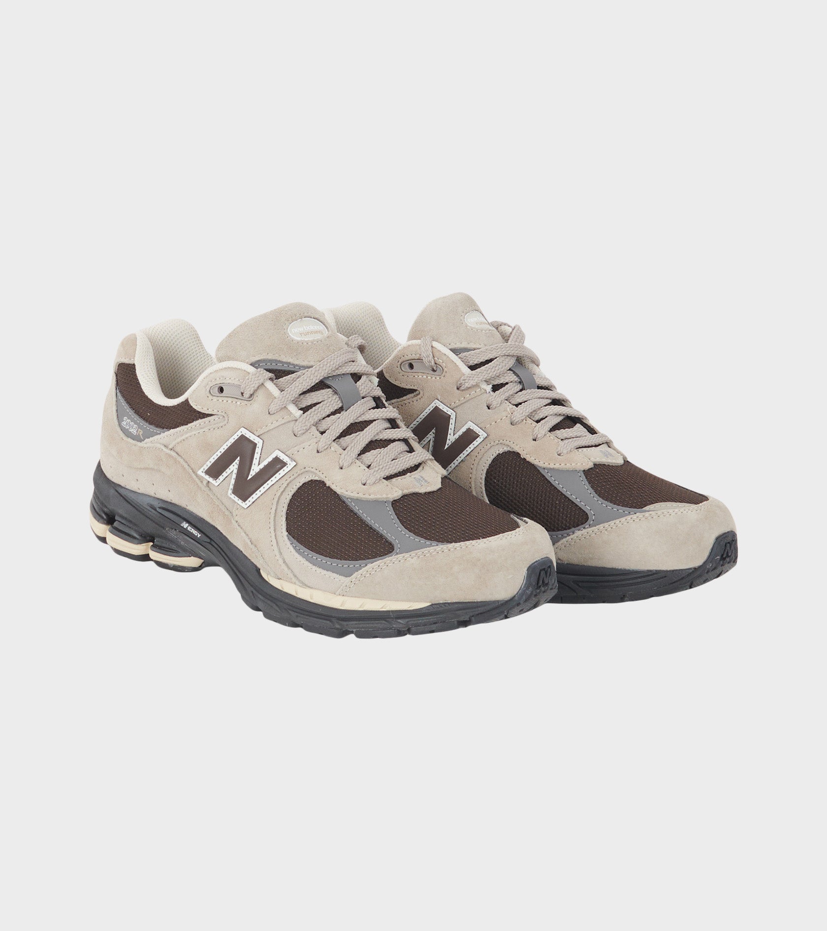 The '2002' model from New Balance in a beige shade with dark brown and grey details.