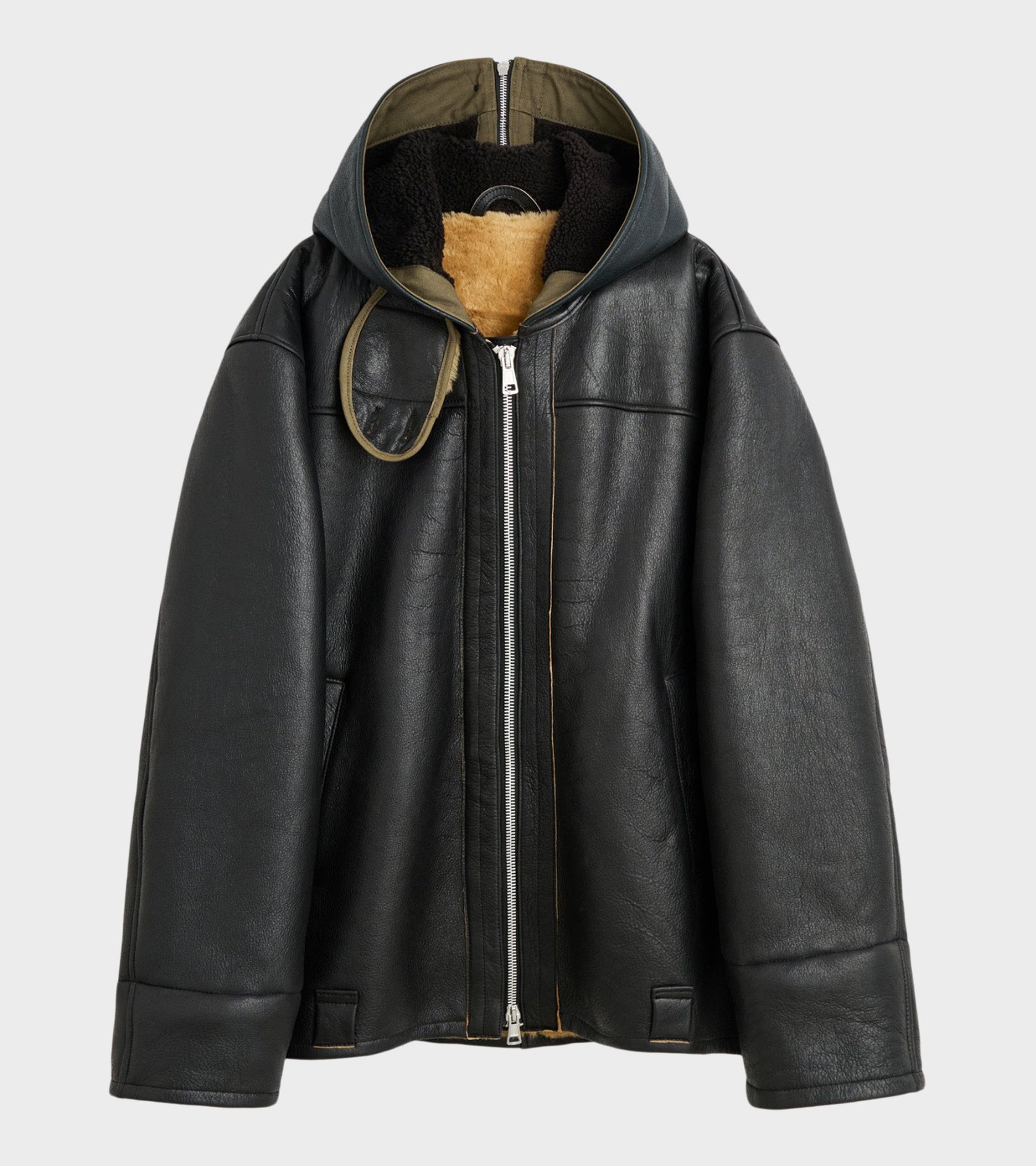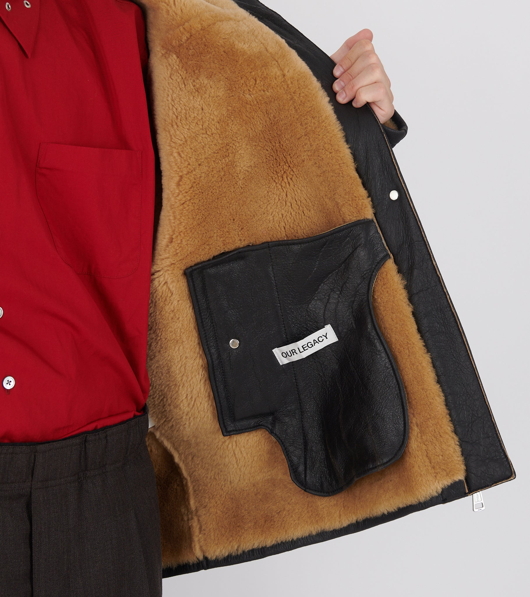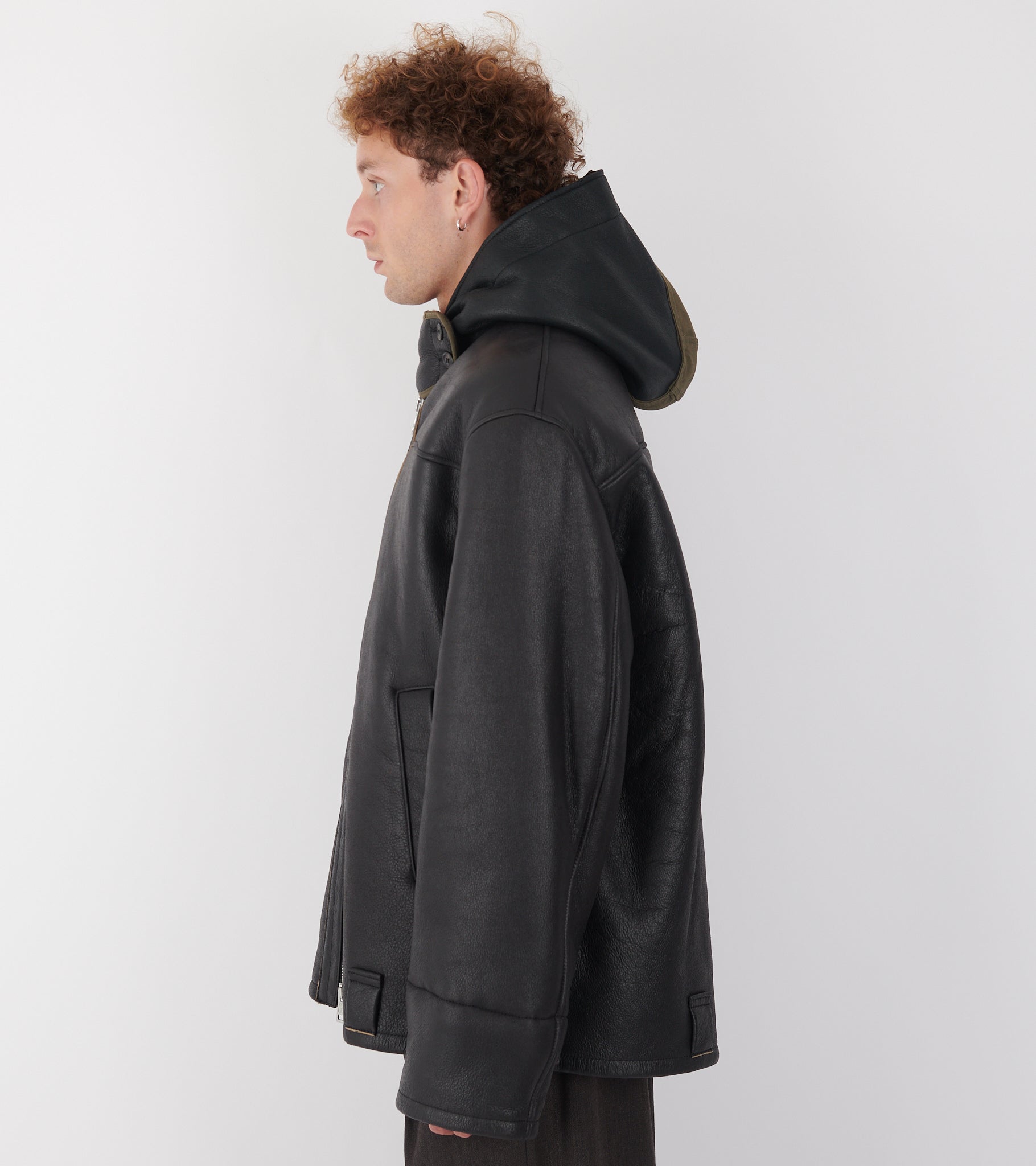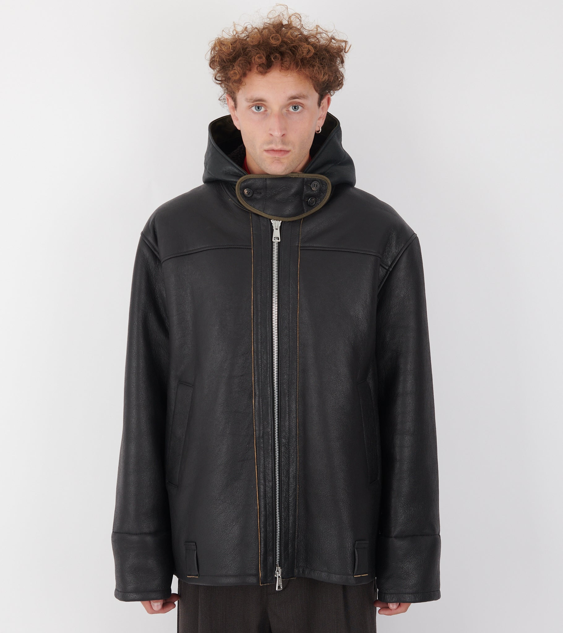 Black lambskin jacket from Our Legacy. The jacket is lined with soft shearling and has a full-zip hood, a storm flap, a pocket on each side and a two-way zip closure on the front. The jacket has details in olive green cotton canvas.