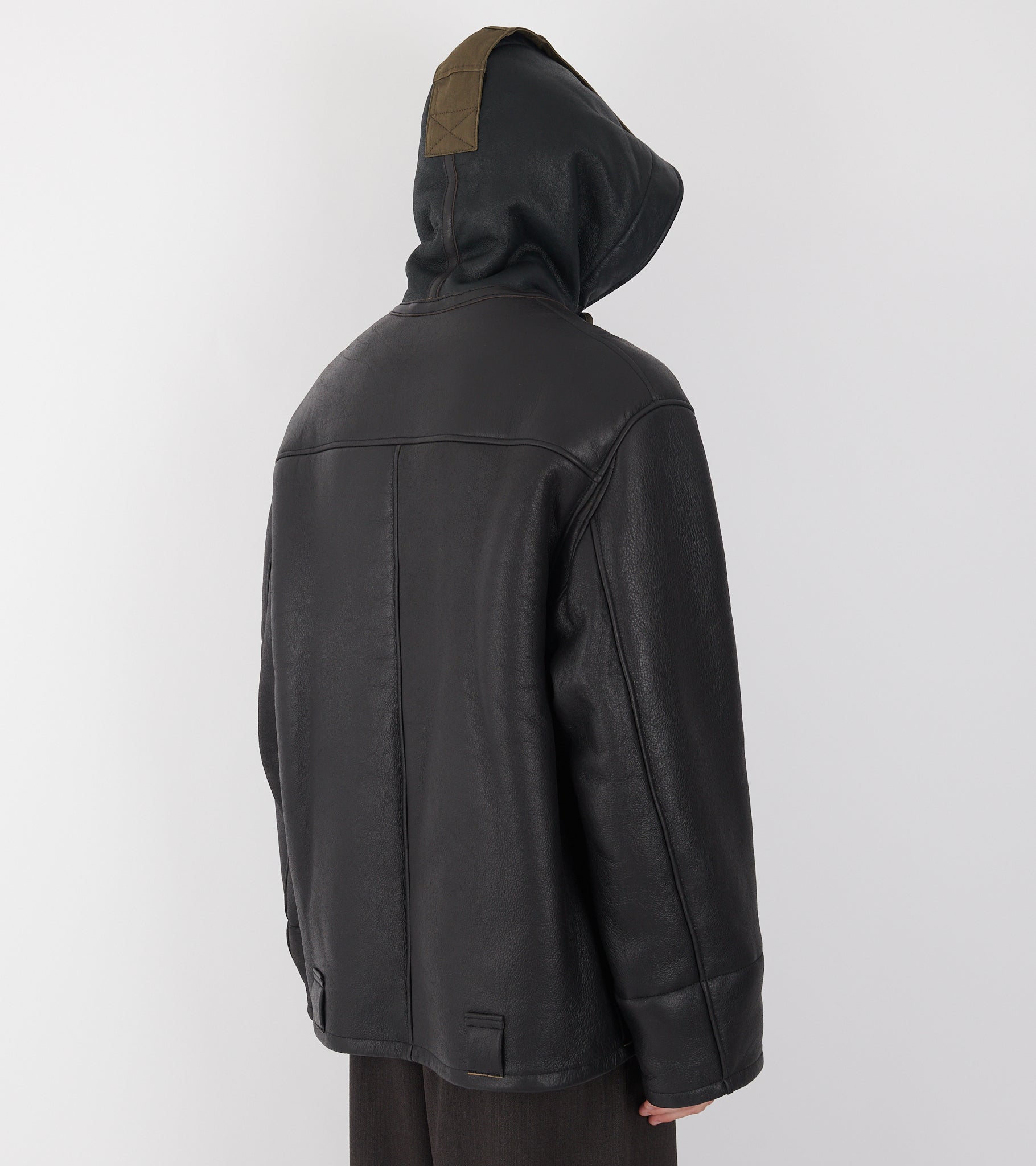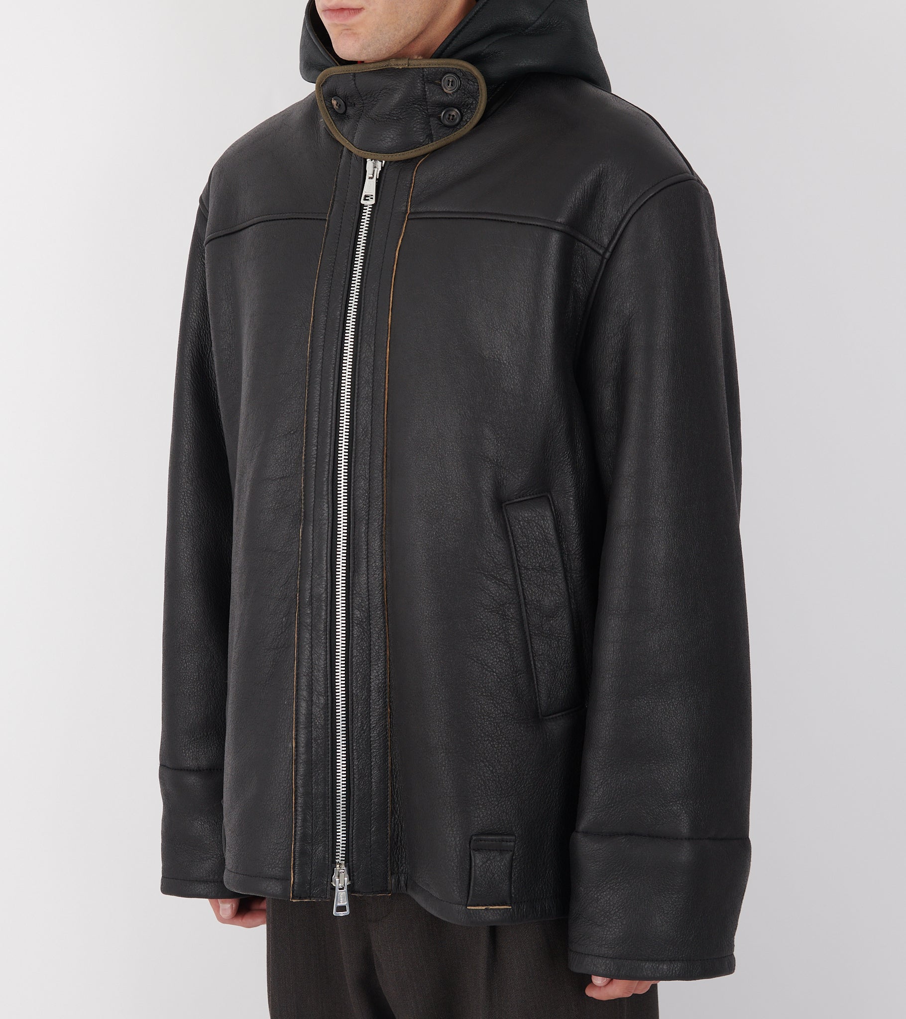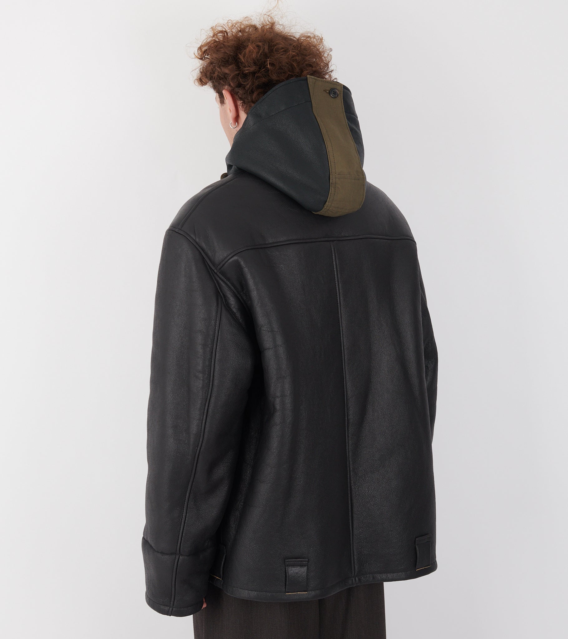 Black lambskin jacket from Our Legacy. The jacket is lined with soft shearling and has a full-zip hood, a storm flap, a pocket on each side and a two-way zip closure on the front. The jacket has details in olive green cotton canvas.