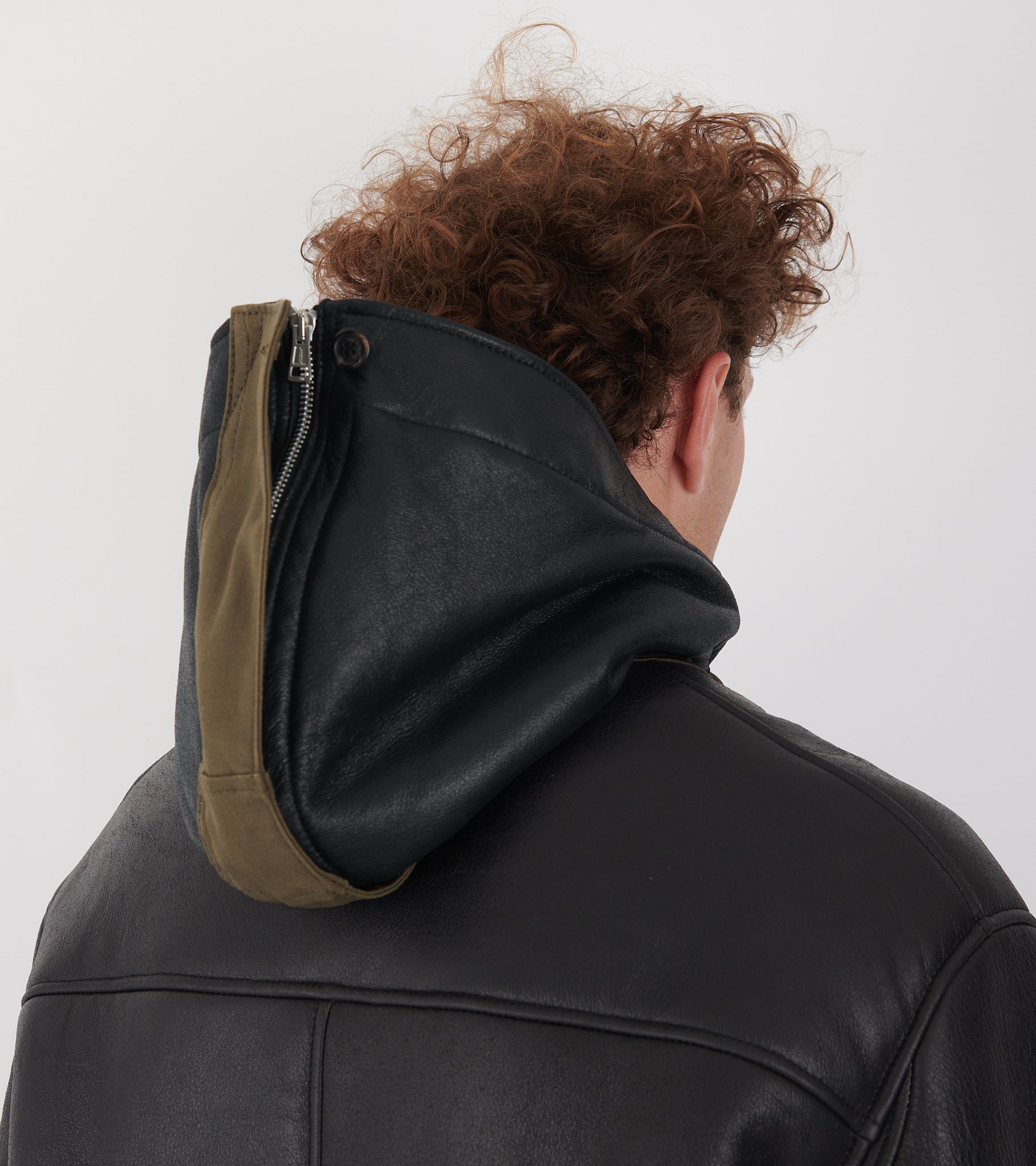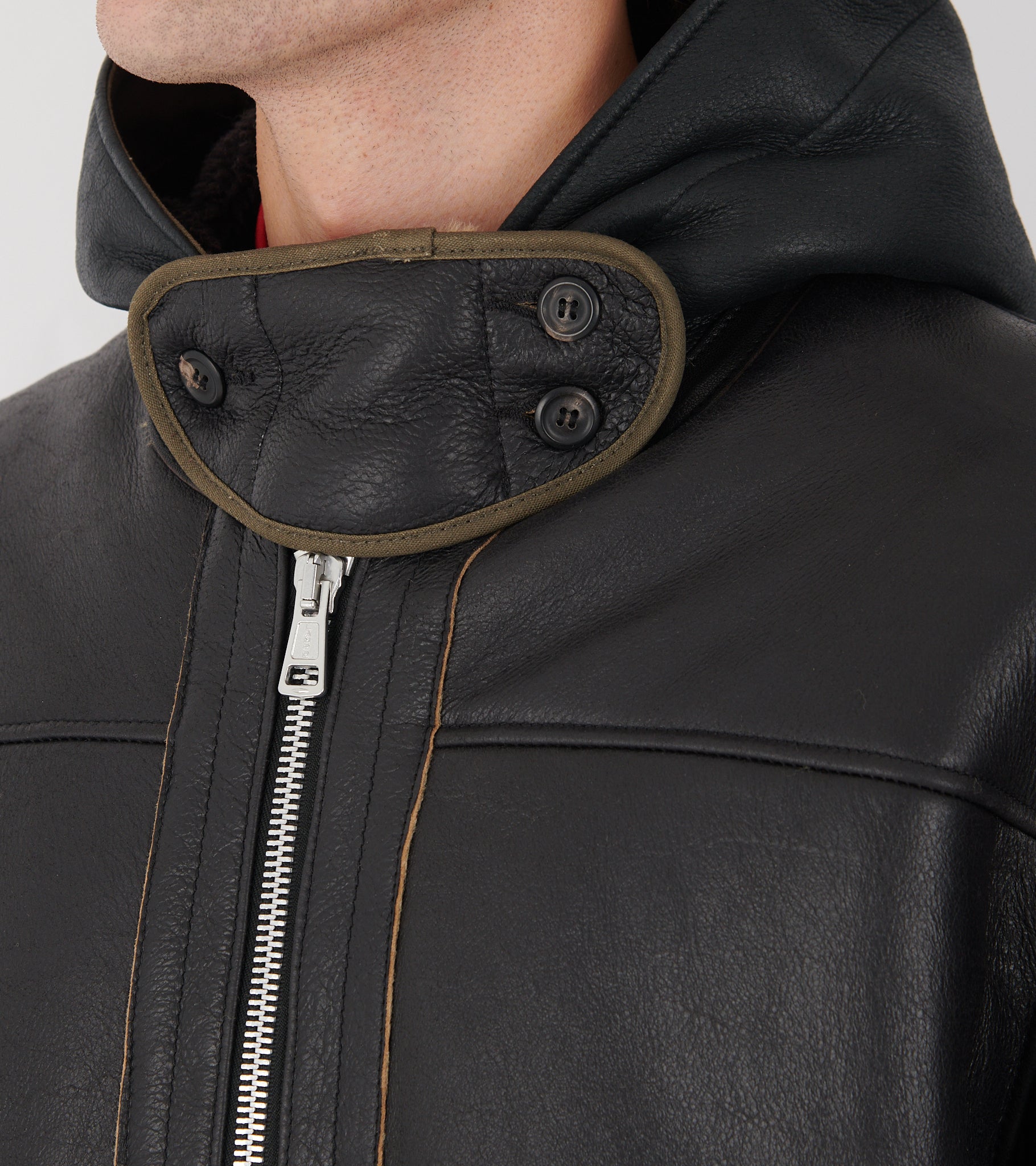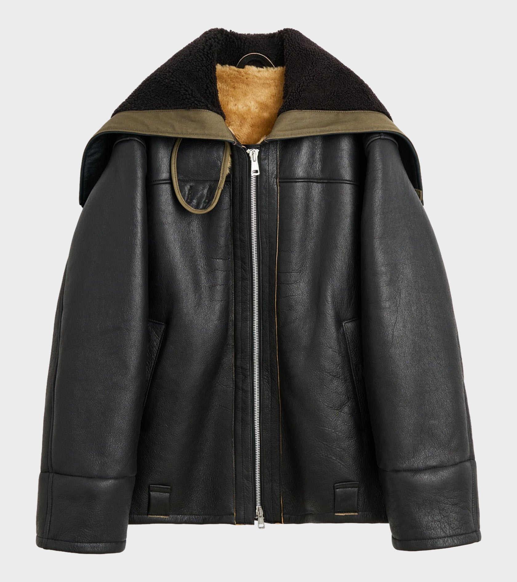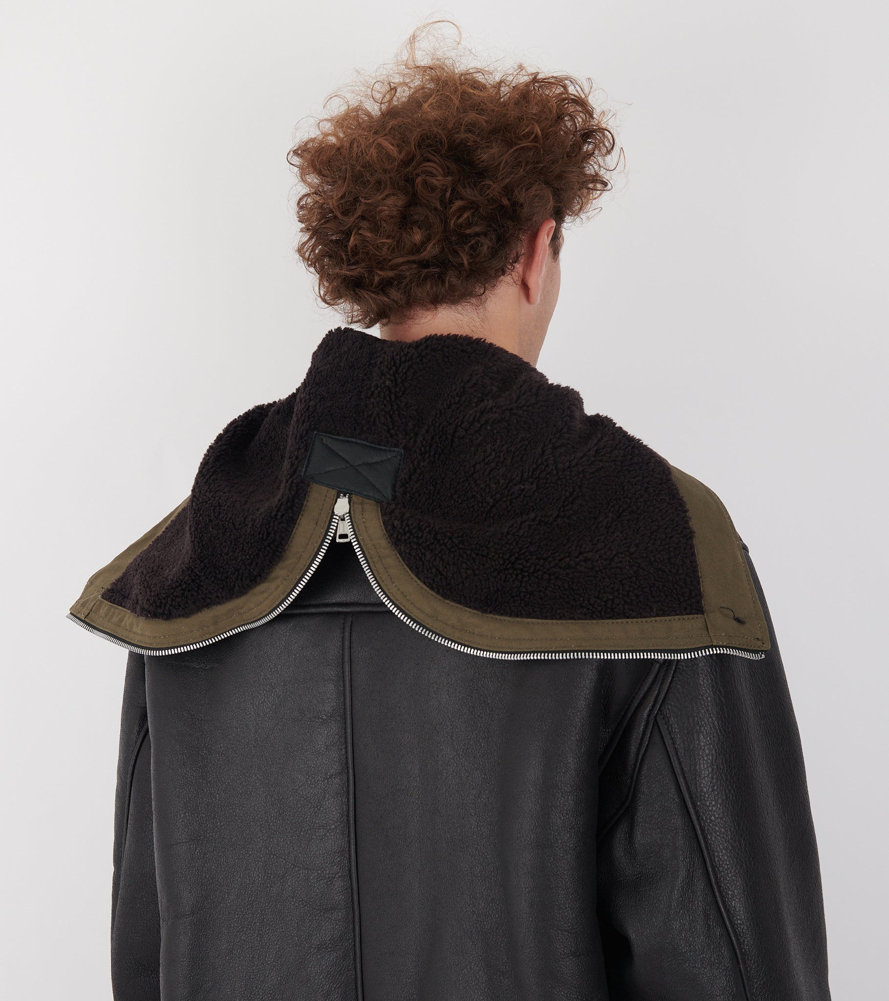 Black lambskin jacket from Our Legacy. The jacket is lined with soft shearling and has a full-zip hood, a storm flap, a pocket on each side and a two-way zip closure on the front. The jacket has details in olive green cotton canvas.