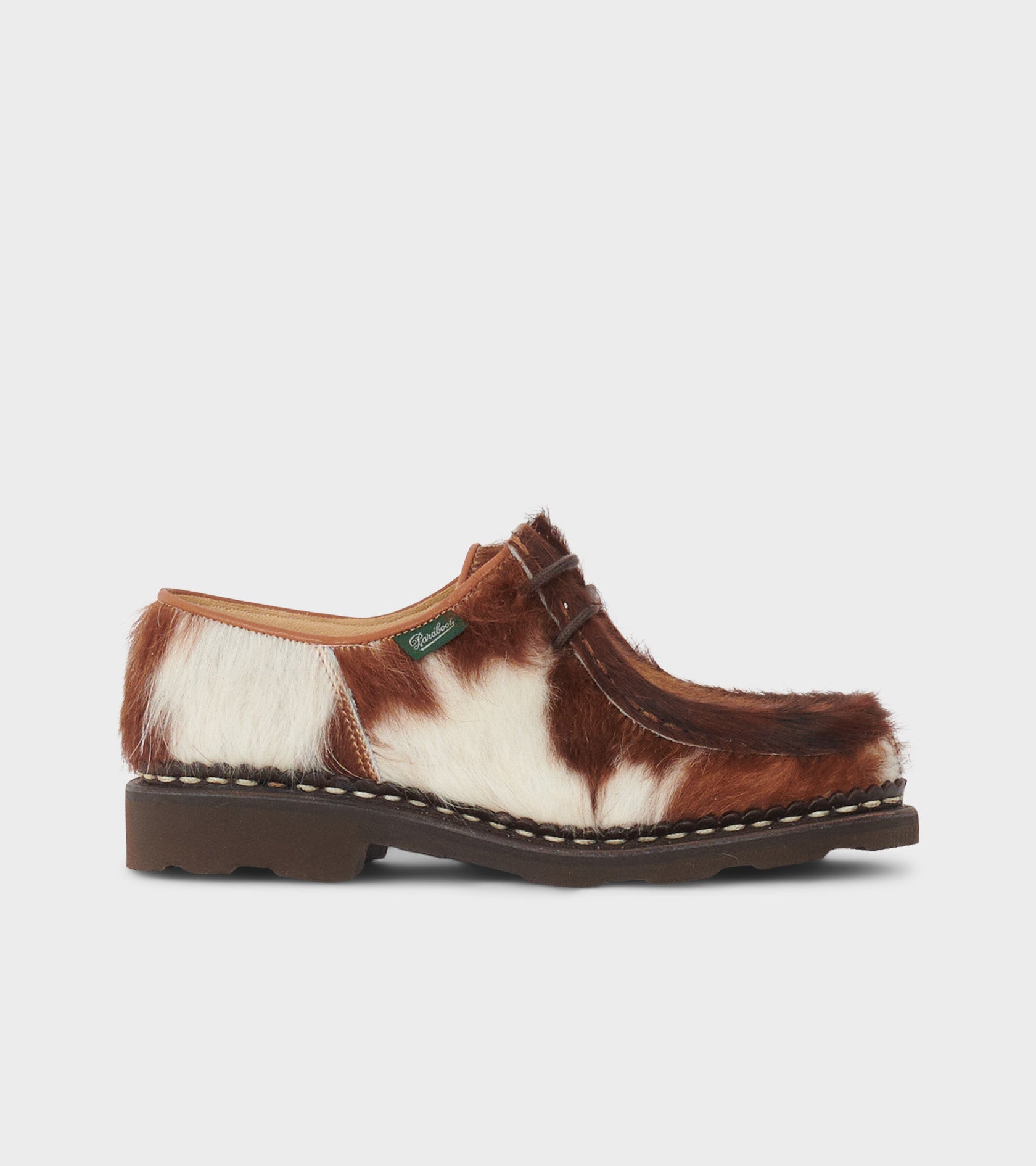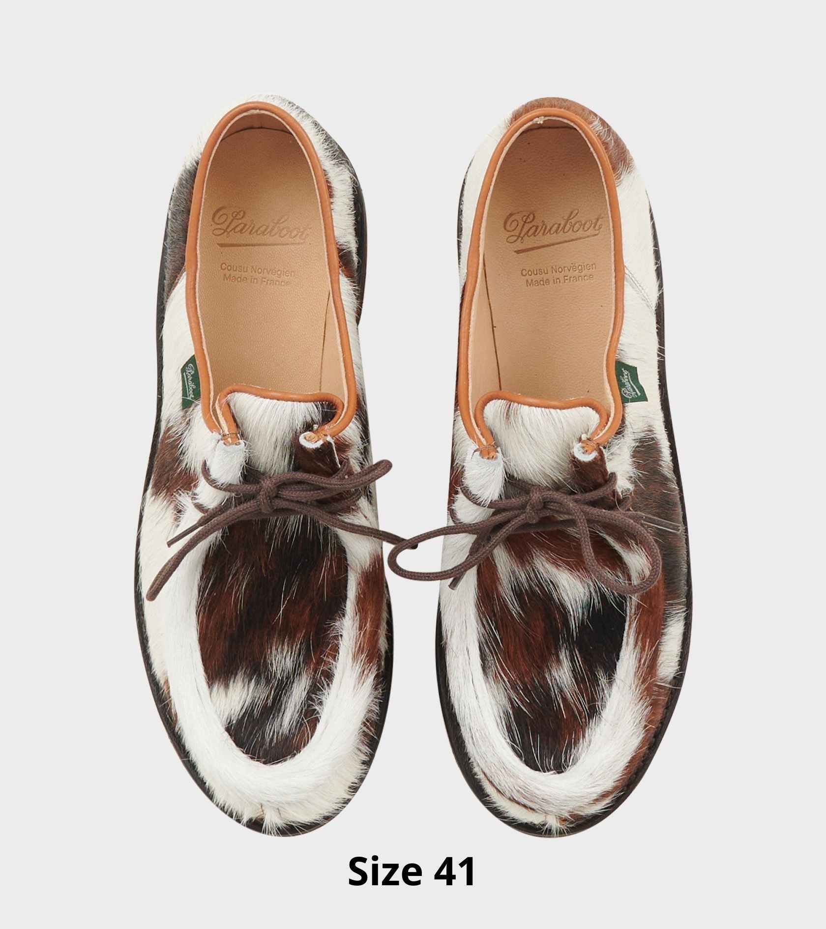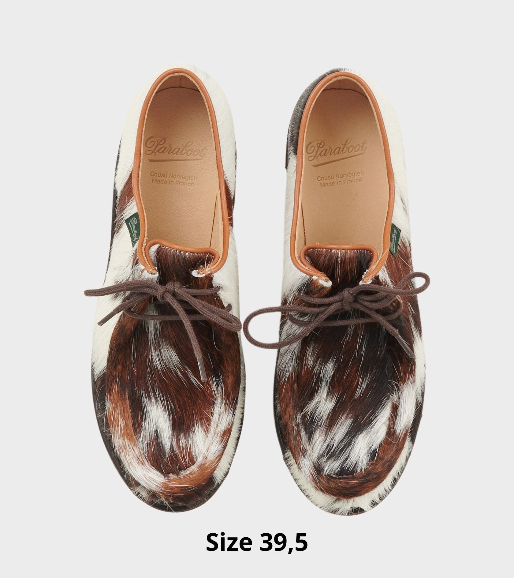 Michael Griff from Paraboot. This shoe has a cow-colored 'pony hair' upper and a small dark green logo on the side. The shoe is made in France and comes with a dustbag.