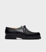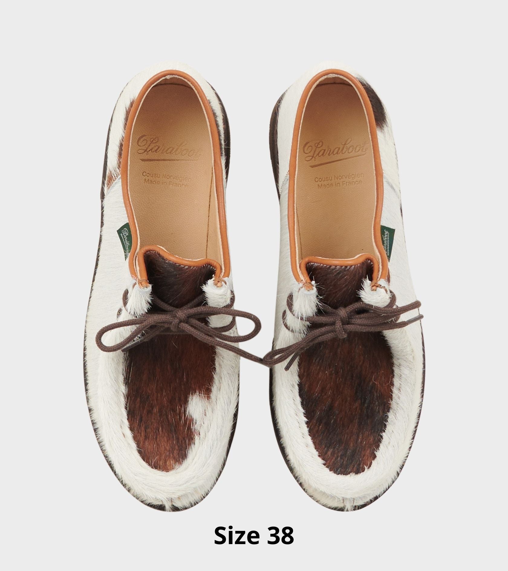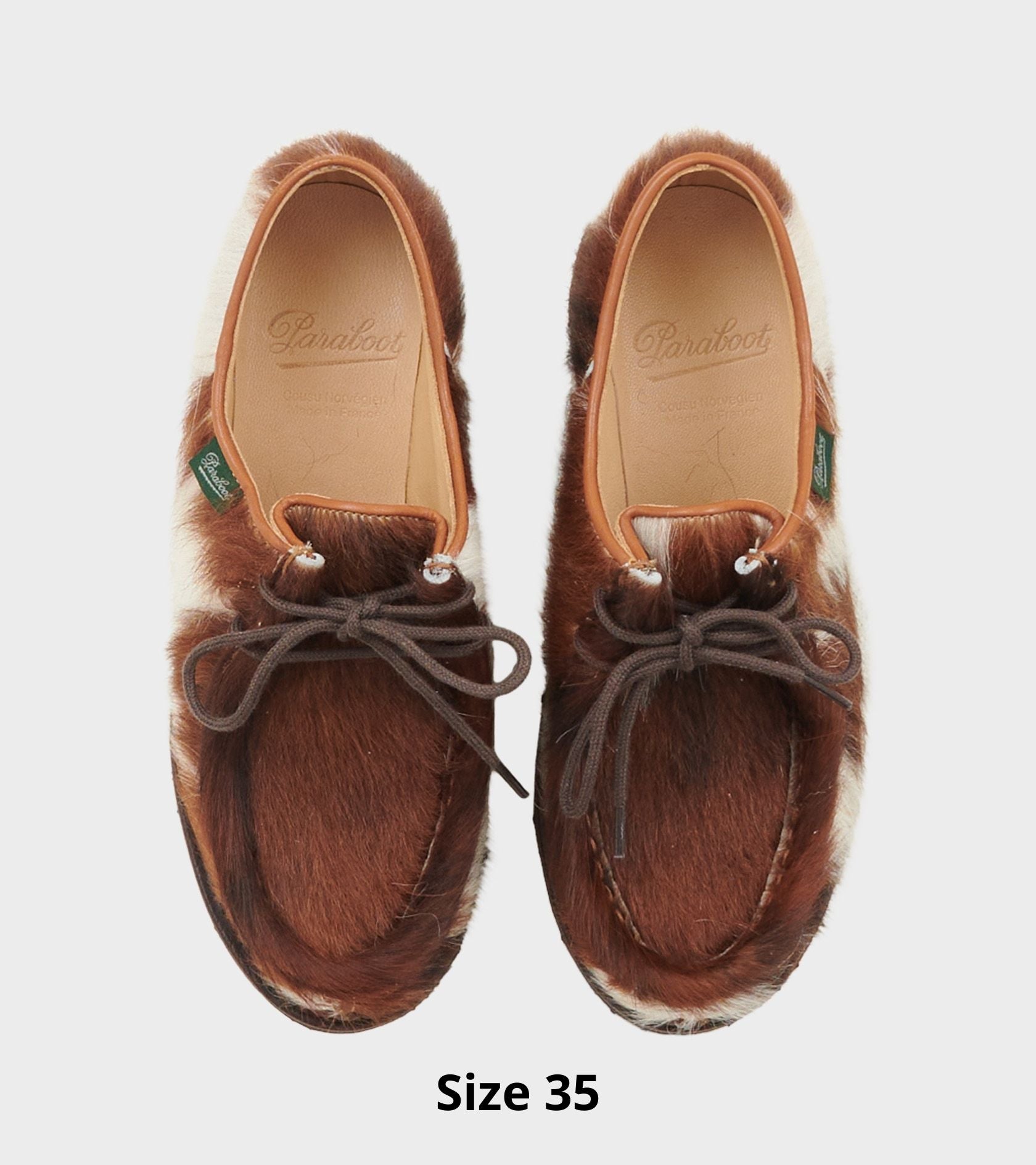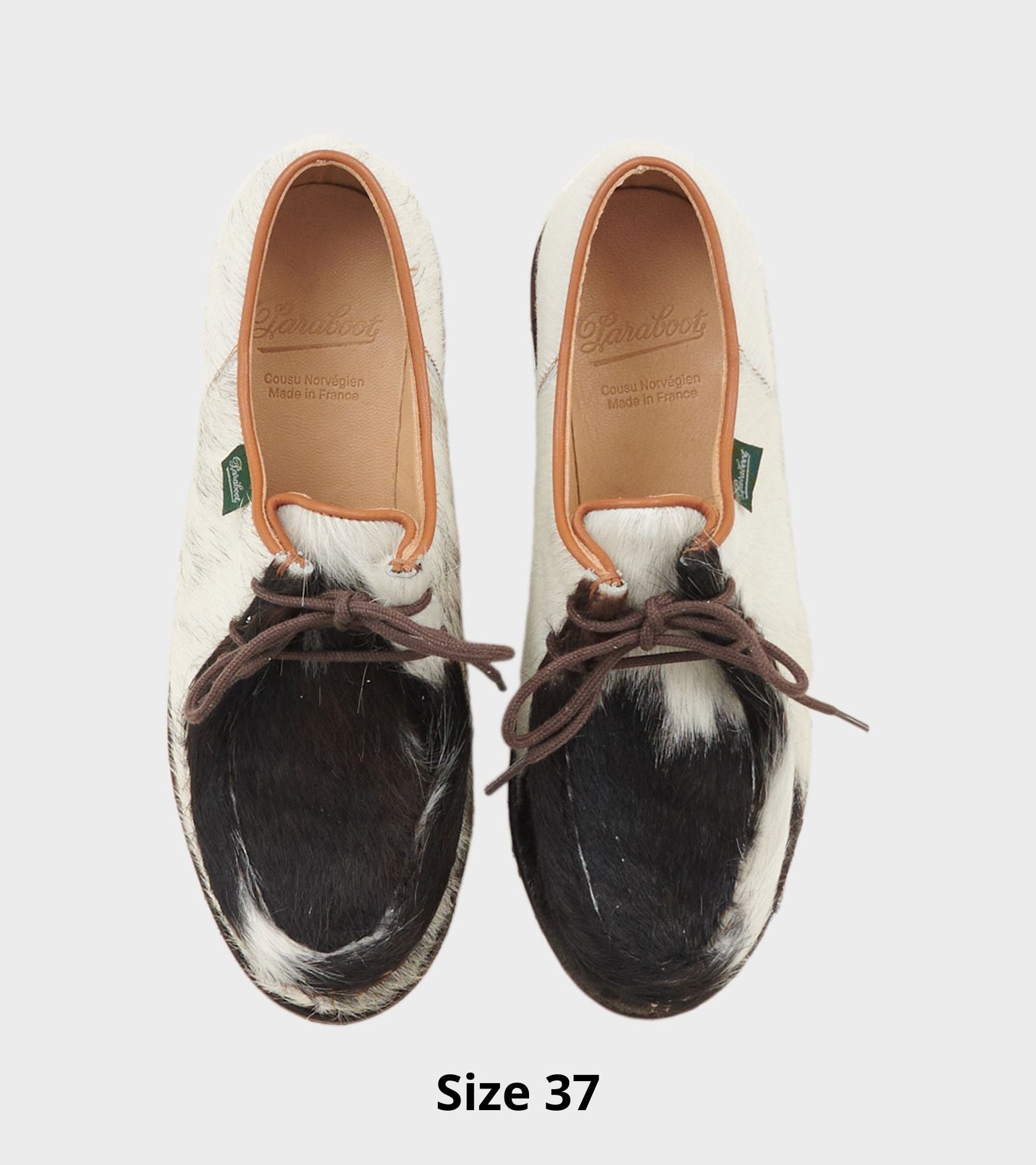Michael Griff from Paraboot. This shoe has a cow-colored 'pony hair' upper and a small dark green logo on the side. The shoe is made in France and comes with a dustbag.