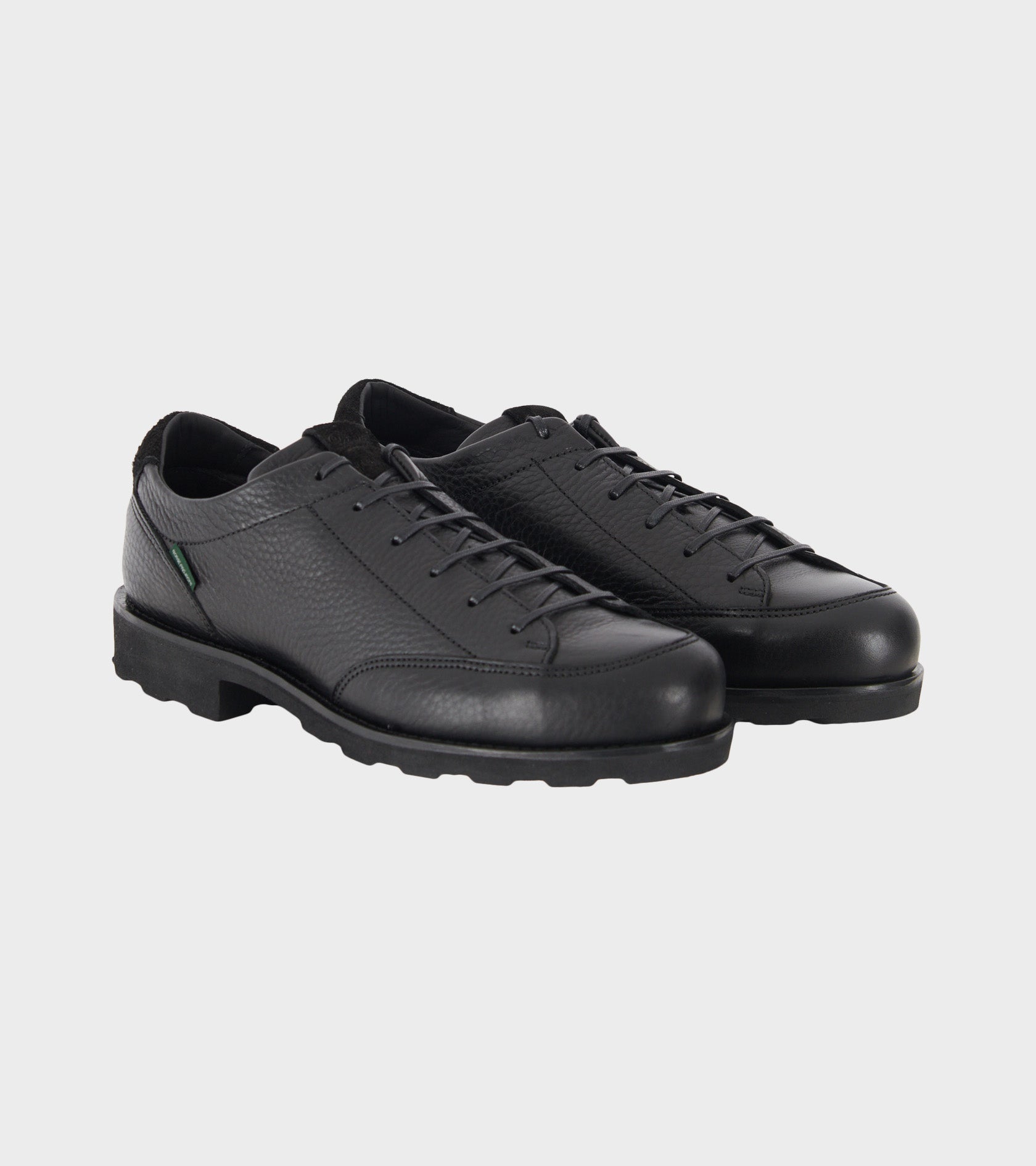 Sierra Foul Noir from Paraboot. These shoes are made of full-grain leather and feature a small green logotag on the side, a classic lace-up closure and suede detailing on the tongue and heel. The shoe is made in France and comes with a dustbag.