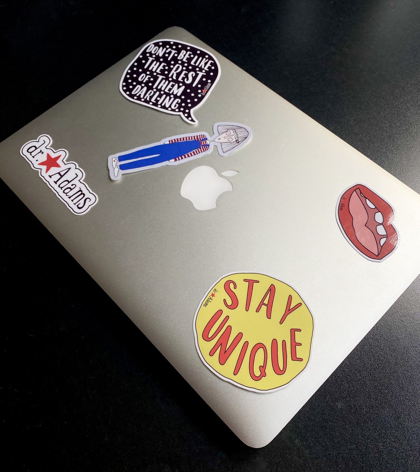 Personligt og unikt klistermærkeark med fem forskellige klistermærker som alle er inspireret af vores lidt skæve dr Adams univers.