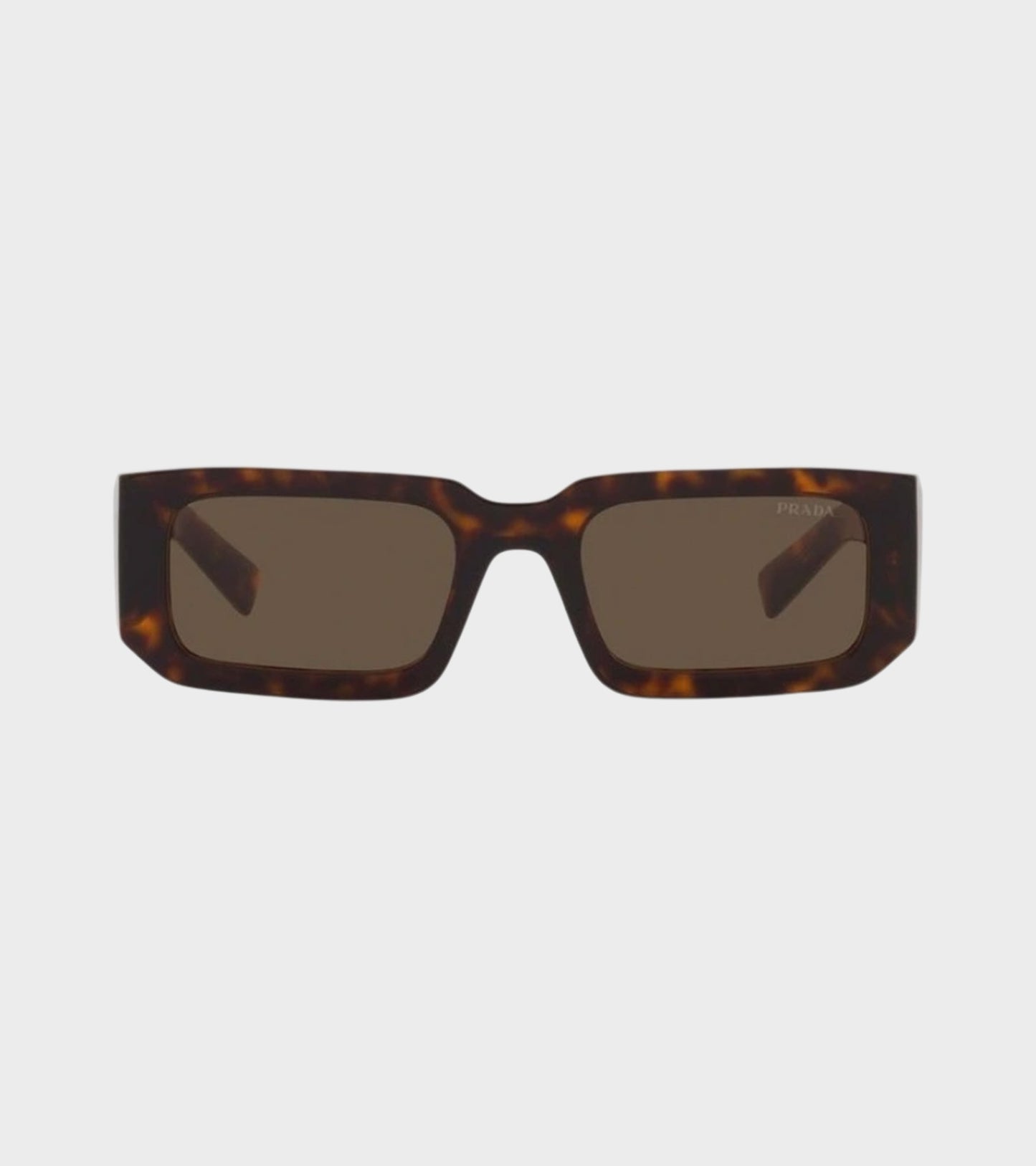 Brune firkantede solbriller fra PRADA eyewear. Solbrillerne er mørke brune med brunt skilpaddemønster samt brunligt glas. I det ene glas er et lille diskret indgraveret logo. På hver side er et sølv logo. Solbrillerne kommer i en sort æske.
