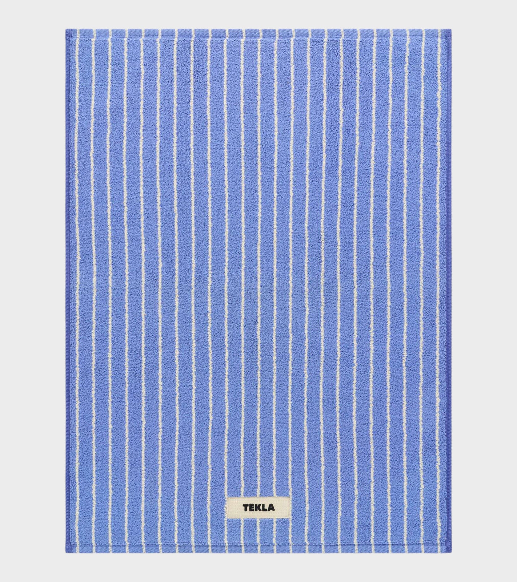 Stribet bademåtte fra Tekla en i klar blå og hvid farvekombination.