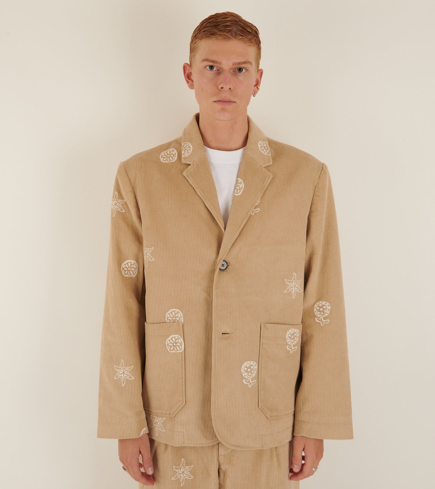 Beige blazer i økologisk bomuldsfløjl fra Soulland. Denne blazer har all-over broderede blomster og søstjerner i råhvid. Den har en klassisk åben blazer-krave, let polstrede skuldre, to åbne lommer, en slids bagpå og en knaplukning med to knapper på fronten.