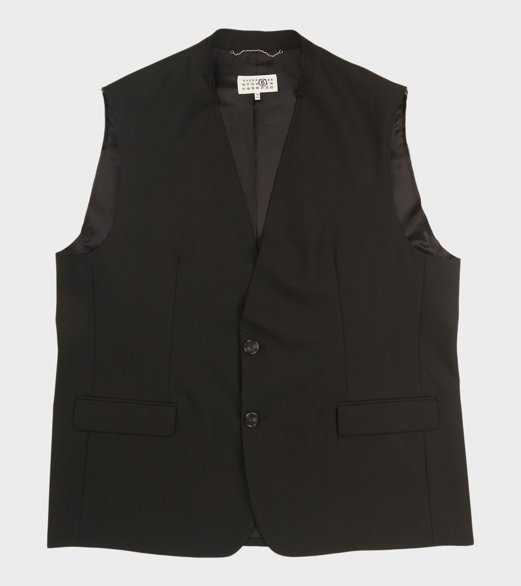 Sort vest fra MM6. Vesten er oversize, lukkes med to knapper og har råskåret kanter. Bagtil har den to slidser, samt den ikoniske hvide syning i nakken. Vesten er lavet i en uldblanding og er produceret i Italien. Indvendigt i nakken er en kæde-detalje.