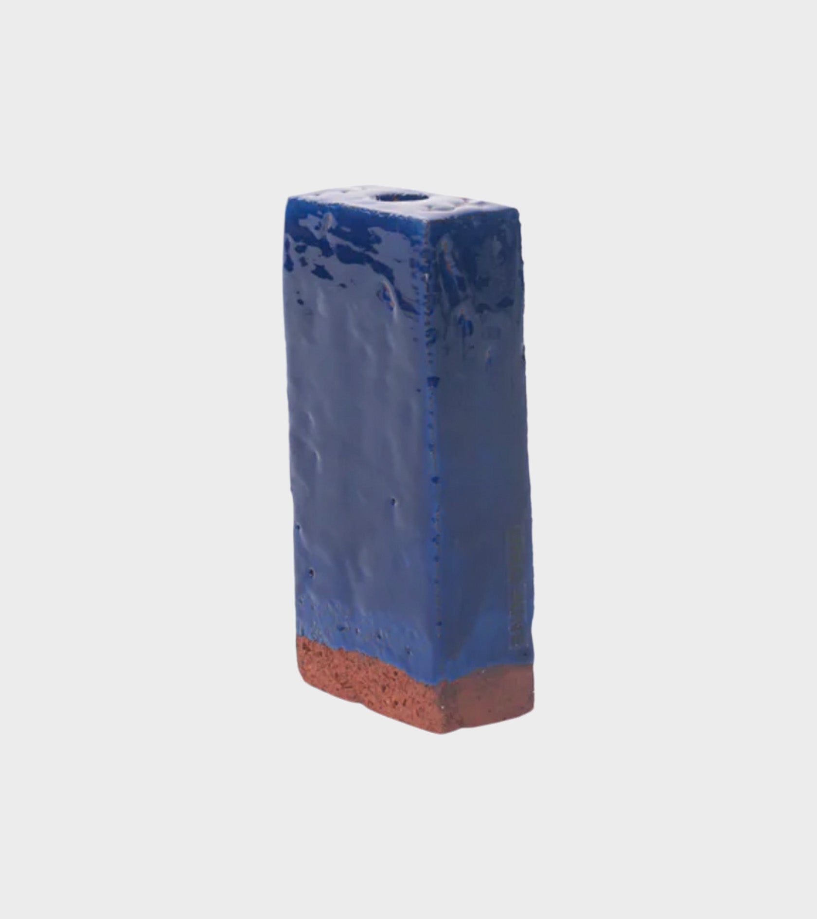 Lysestage i lertøj fra Niko June. Denne lysestage er glaseret i mørkeblå og har et logo på siden. Den er fremstillet i rødt, lokalproduceret ler.