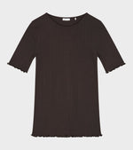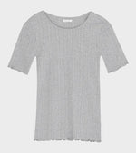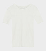 Råhvid t-shirt i økologisk bomuldsjersey fra Skall Studio. Edie Tee har korte ærmer, hulmønster, en rund hals og babylock-kanter.