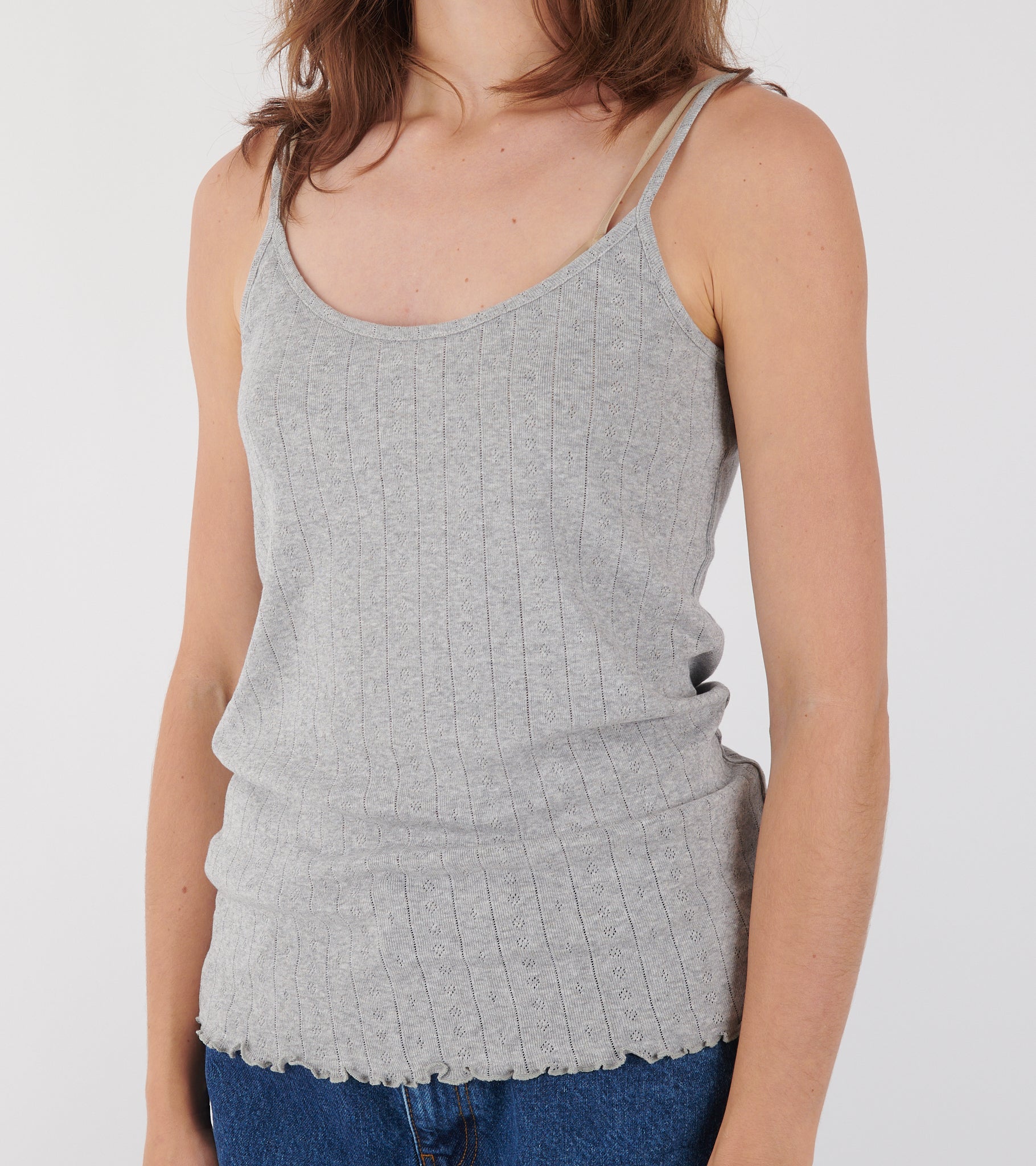 Lysegrå top i økologisk bomuldsjersey fra Skall Studio. Edie Cami Top har hulmønster, smalle stropper og babylock-kanter.