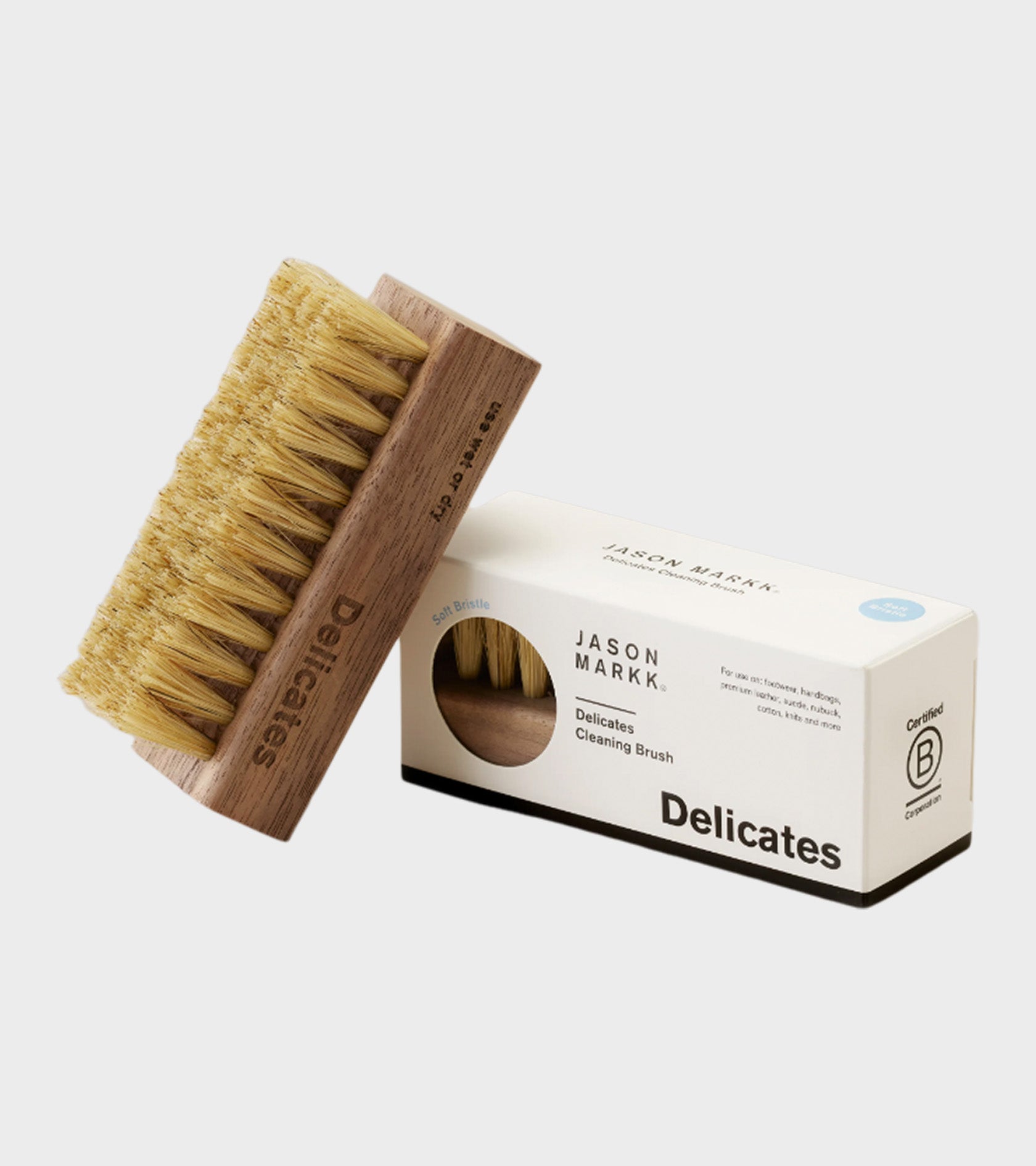 Premium Cleaning Brush fra Jason Markk. Denne børste er har et håndtag skåret i valnøddetræ samt et vildsvin-børstehoved. Børsten kan bruges på læder, ruskind, bomuld samt mesh.