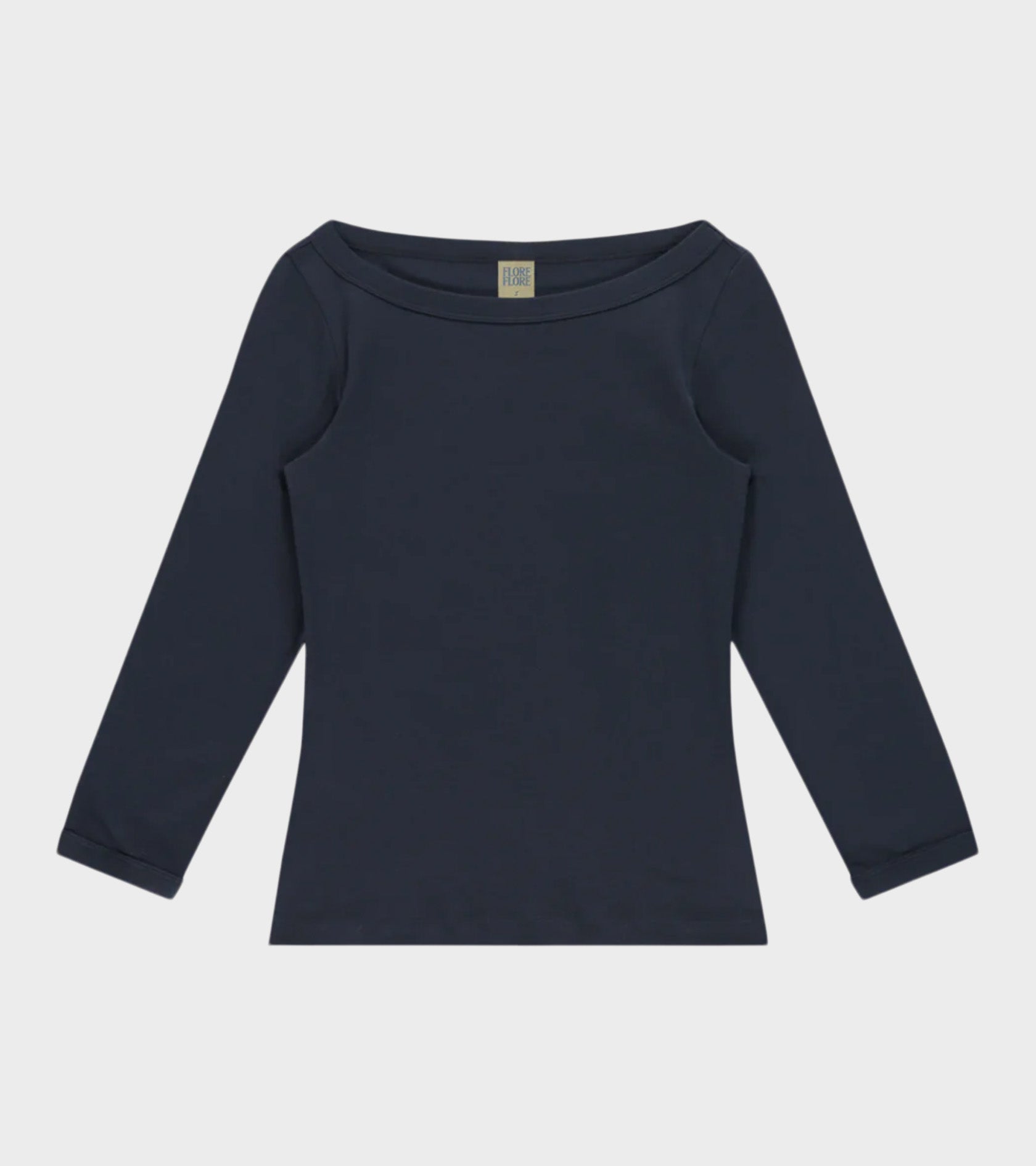 Navy bluse fra Flore Flore. Steffi Tee er fremstillet i en 'medium weight' økologisk bomuldskvalitet og har en bådudskæring samt 3/4 lange ærmer. Den er produceret i Portugal og har en let tætsiddende pasform.