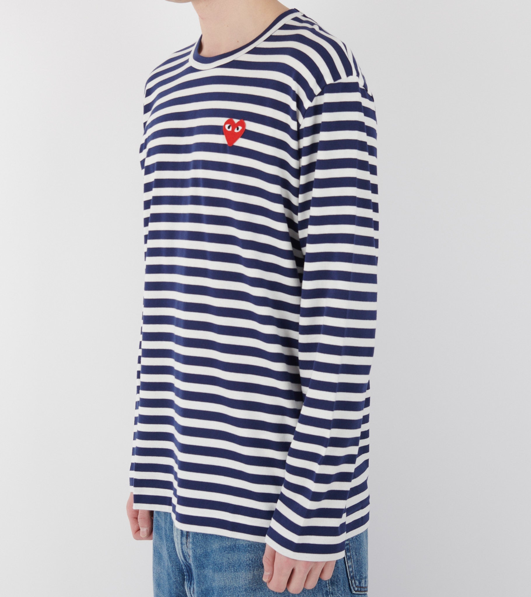 Navy og hvid stribet langærmet t-shirt fra Comme Des Garcons PLAY. Denne t-shirt har det karakteristiske hjerte med øjne broderet i rød. Hjertet er designet af Filip Pagowski, og er gennemgående på alle PLAY produkter.