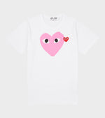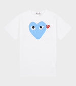 Hvid unisex t-shirt fra Comme des Garcons PLAY med mærkets karakteristiske hjerte med øjne. Det ikoniske hjerte med øjnene fra PLAY er designet af Filip Pagowski og er gennemgående på alle PLAY produkter. Denne t-shirt har et stort printet rødt hjerte samt et lille broderet.