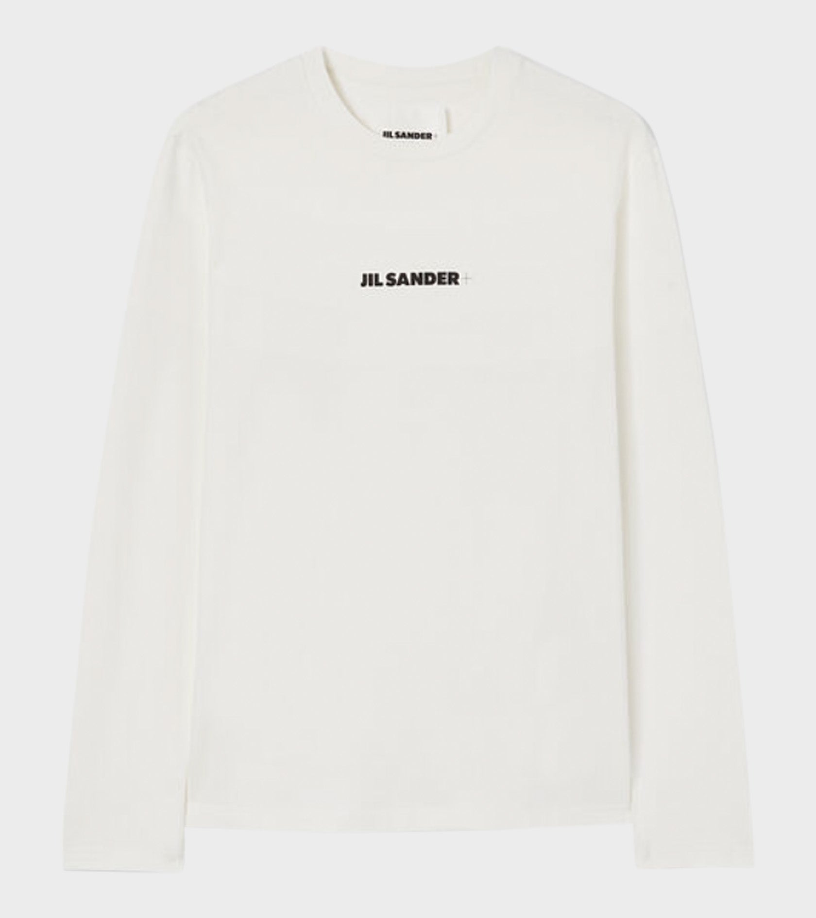 Hvid langærmet t-shirt fra Jil Sander. Denne t-shirt er produceret i Italien og har sort logoprint på fronten.