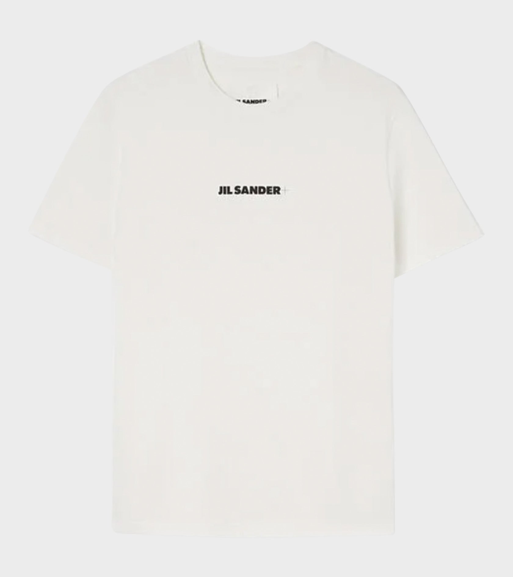 Hvid t-shirt fra Jil Sander. Denne t-shirt er produceret i Italien og har sort logoprint på fronten.