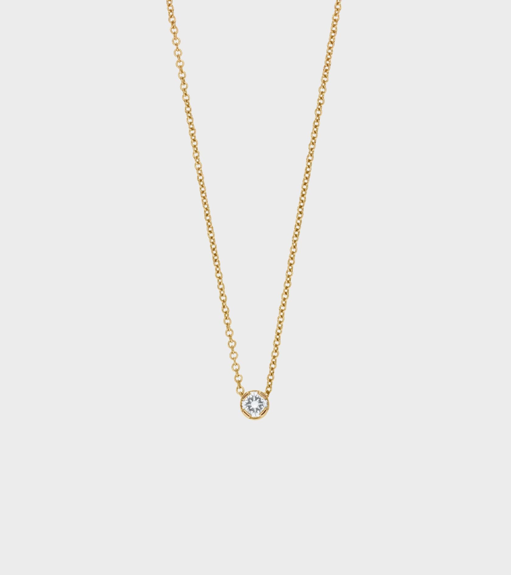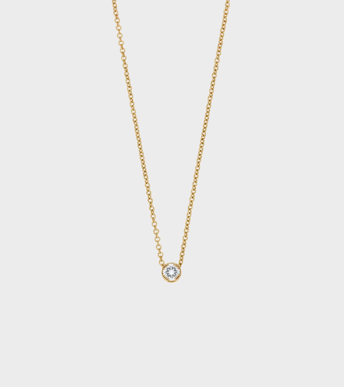 Halskæde i 18 karat certificeret og genanvendt guld fra Sophie Bille Brahe. Halskæden har et lille rundt vedhæng med en 0,12 karat Top Wesselton VVS diamant. Den måler 40 cm og kommer med et certifikat.