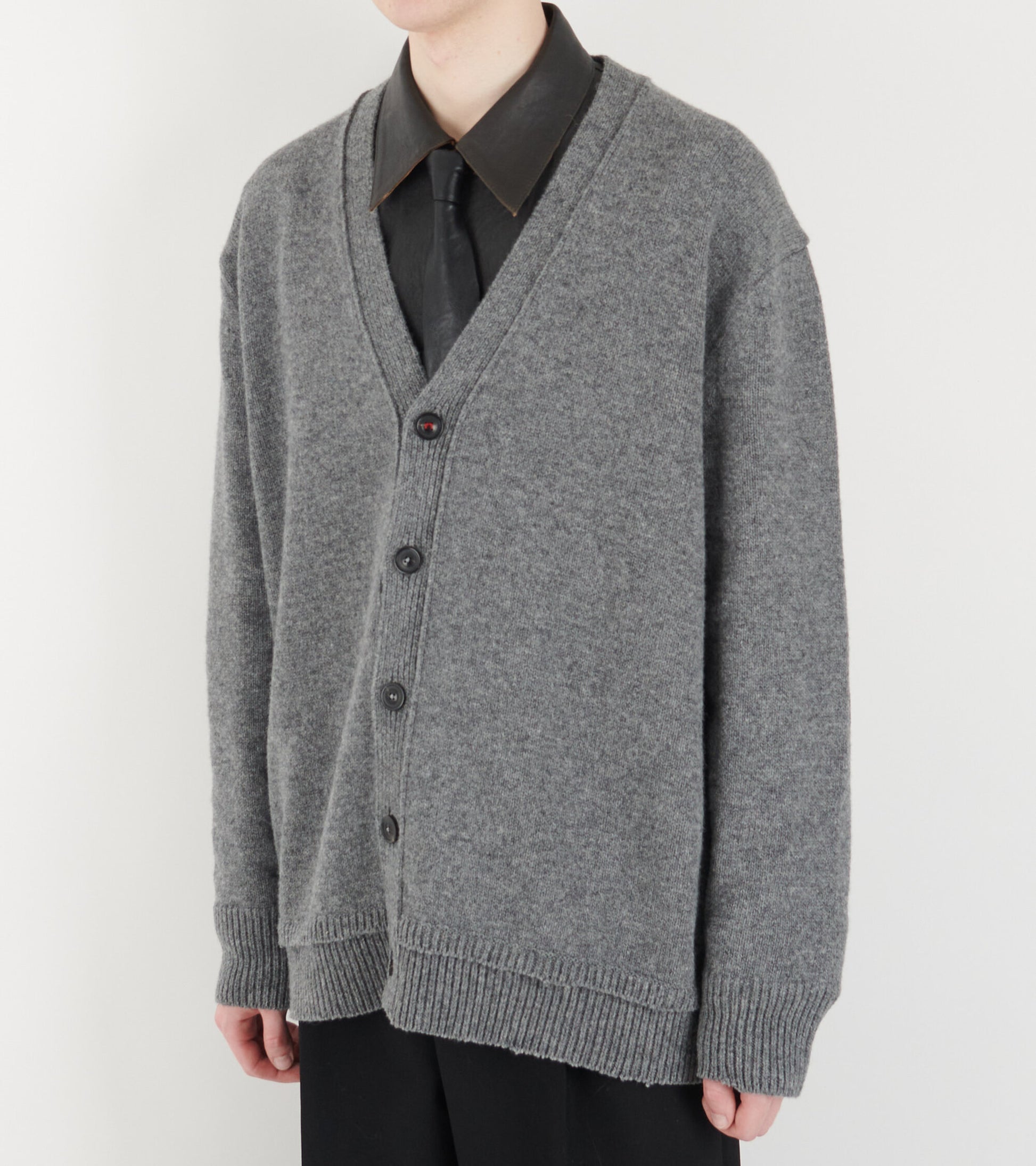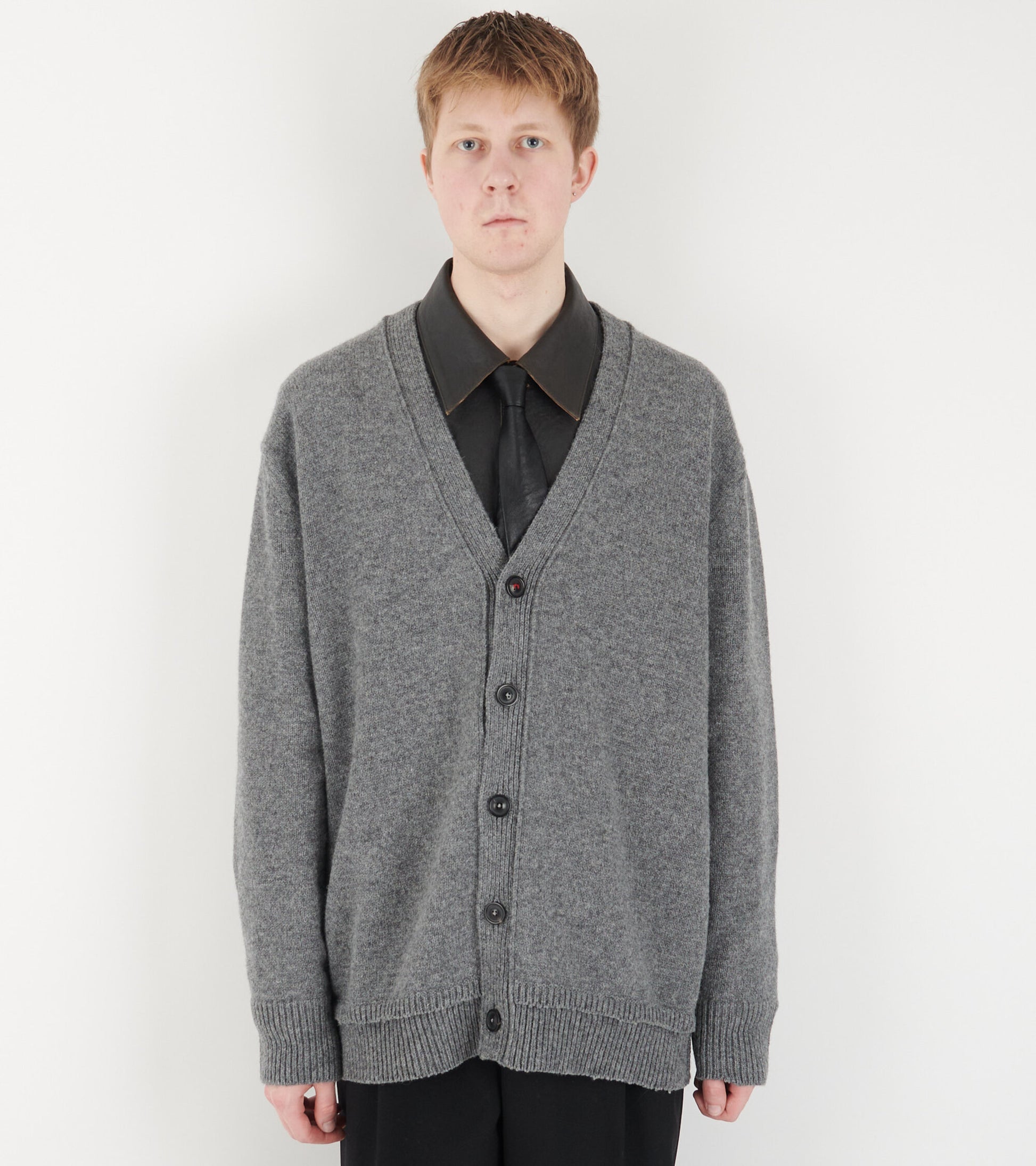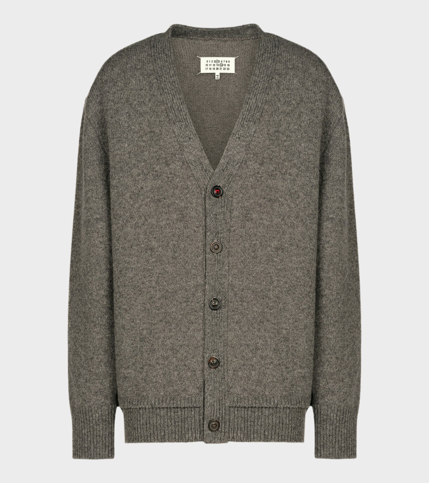 Grå cardigan fra Maison Margiela. Denne cardigan er fremstillet i en blanding af uld, hør og bomuldsgarn. Den har en v-udskæring, en knaplukning og det ikoniske 'Four Stitchings' øverst bagpå. Den øverste knap er syet på med et rødt 'M'. Ved albuerne er en patch detalje i brunt kalveskind. Den er produceret i Italien og har en oversize pasform.