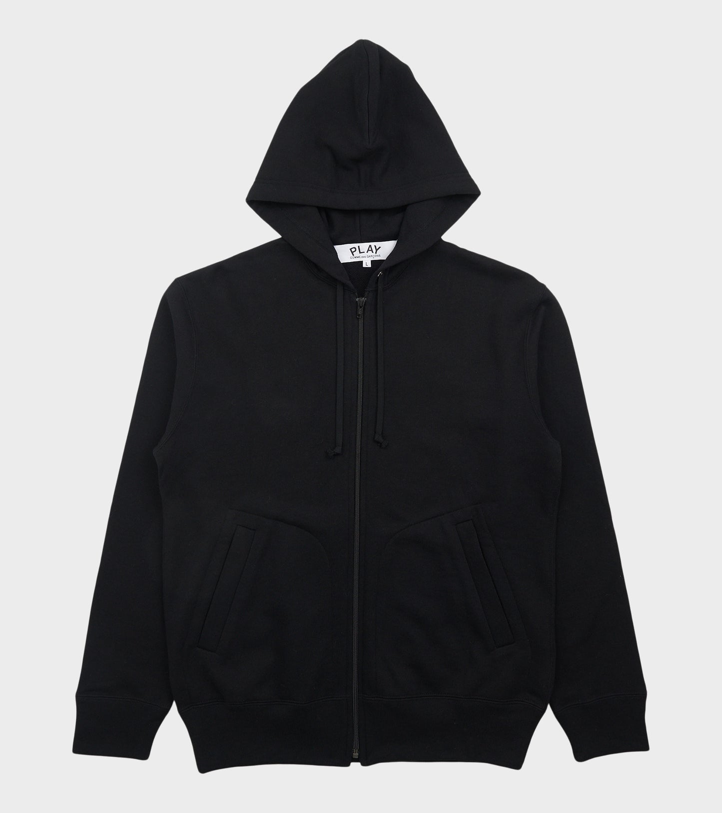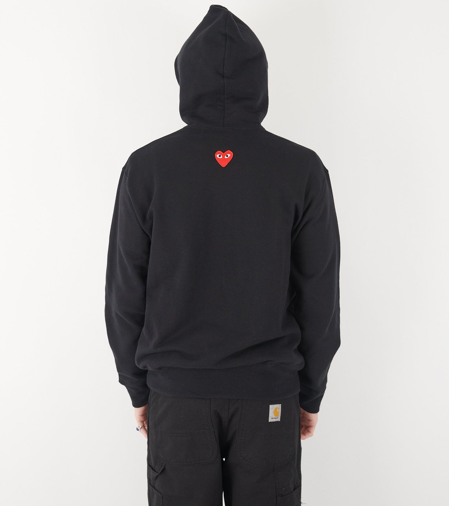 Sort hættetrøje fra Comme des Garcons PLAY. Denne hættetrøje er unisex og har det karakteristiske hjerte med øjne broderet i rød øverst bagpå. Hjertet er designet af Filip Pagowski, og er gennemgående på alle PLAY produkter. Hættetrøjen har en klassisk hætte med snore, en lynlåslukning og en kængurulomme på fronten.