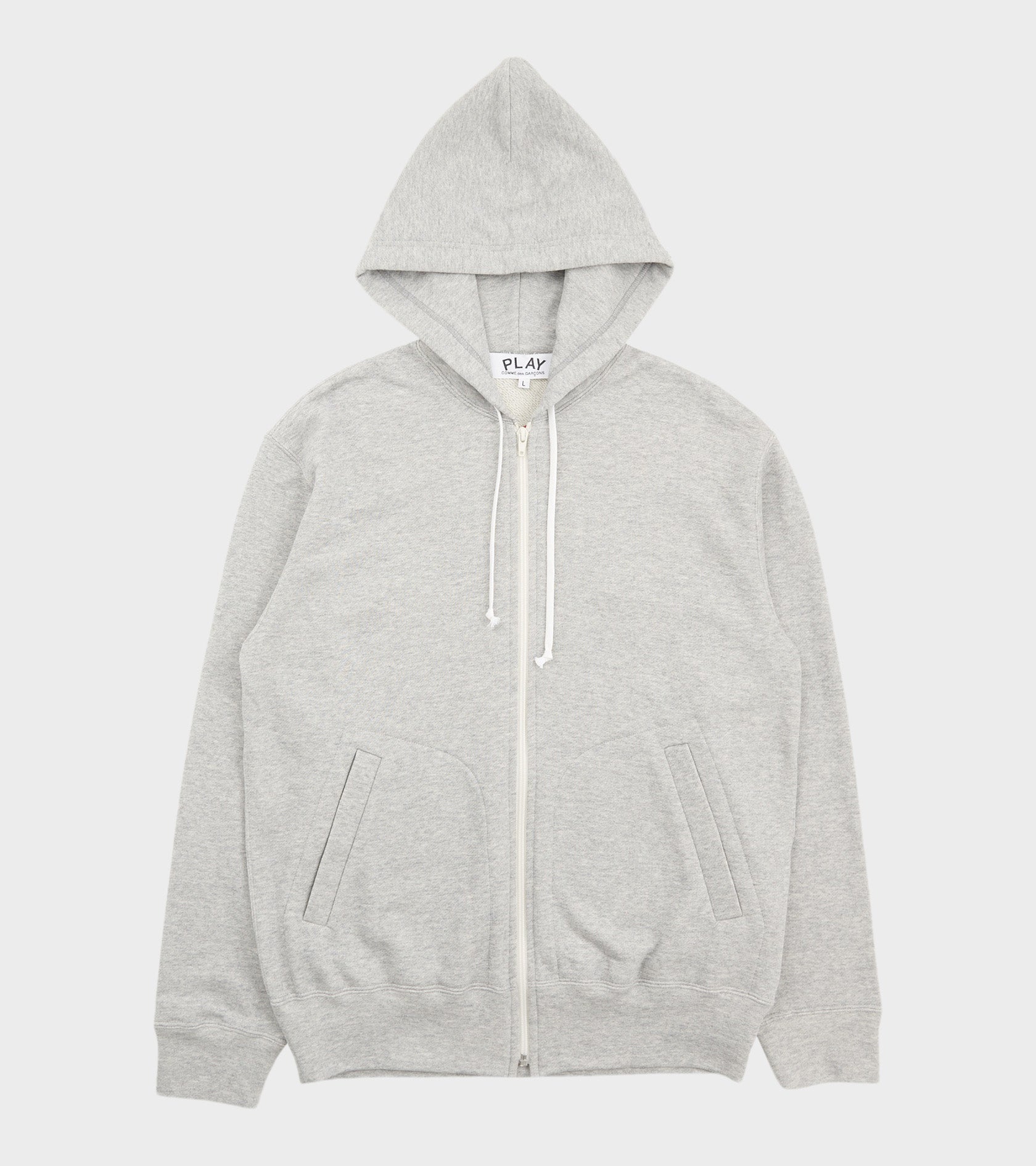 Grå unisex hættetrøje fra Comme des Garcons PLAY. Hættetrøjen har en klassisk hætte med hvide snore, en lynlåslukning og en kængurulomme på fronten. Øverst bagpå er det røde PLAY-hjerte broderet. Det ikoniske hjerte med øjnene fra PLAY er designet af Filip Pagowski og er gennemgående på alle PLAY produkter.