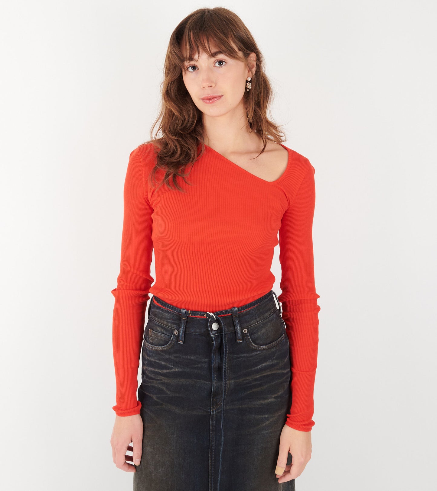 Rød rib bluse i økologisk bomuld fra OperaSPORT. Eve Seamless Top har lange ærmer og en asymmetrisk udskæring ved halsen. Blusen har en tætsiddende pasform.