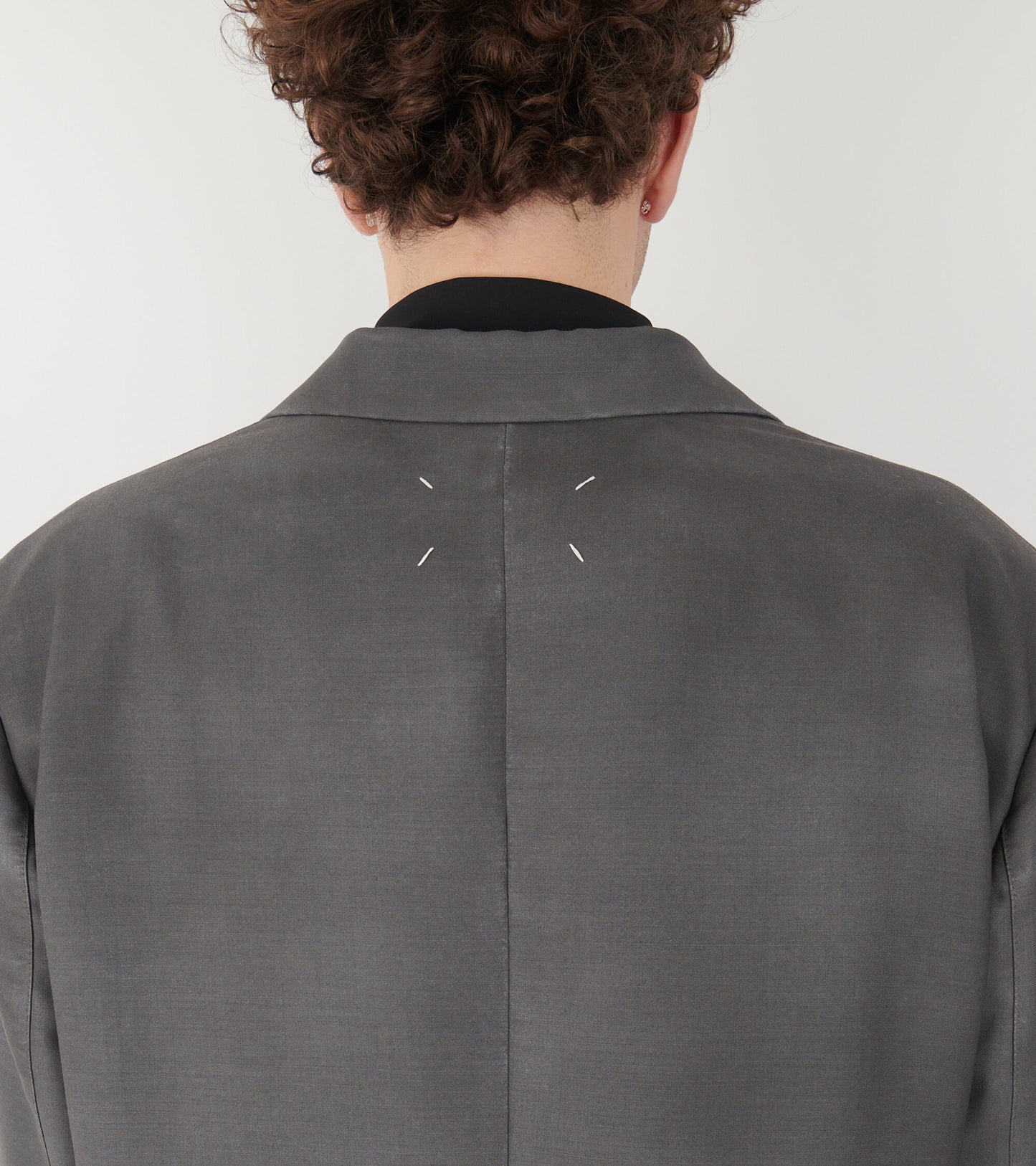 Grå blazer fra Maison Margiela. Denne blazer er fremstillet i en mohair-uldblanding med en håndlavet 'greasy patina' teknik, som efterlader den med et brugt og ujævnt finish. Blazeren har en knaplukning med to knapper, tre lommer på fronten, to slidser bagpå, en klassisk blazer-krave og polstrede skuldre. Øverst bagpå er de ikoniske 'Four Stitchings'. Blazeren er produceret i Italien og har en oversize pasform.