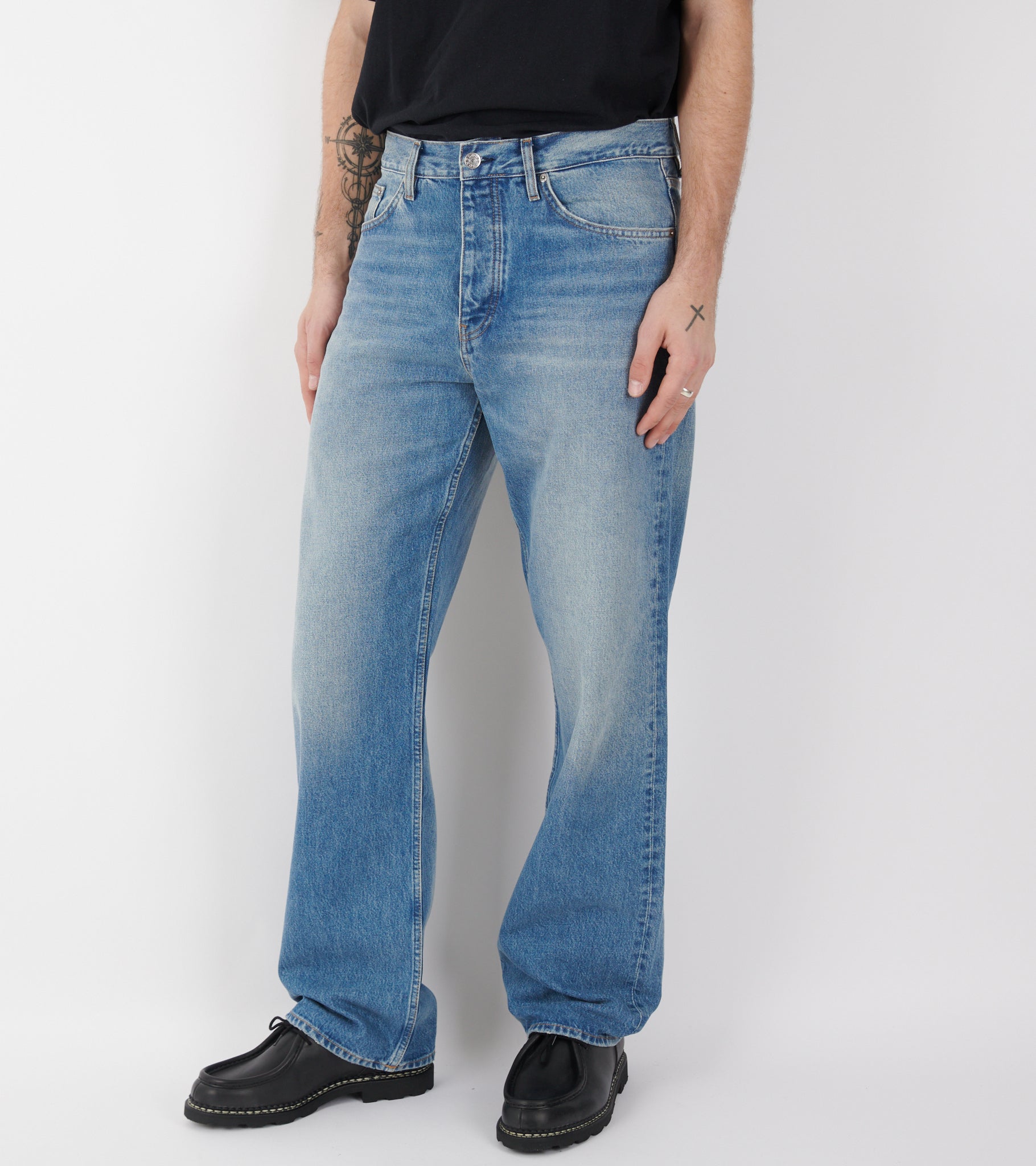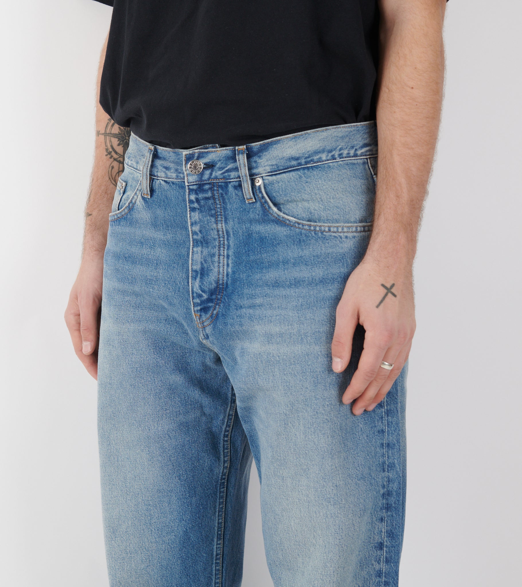 Jeans fra Sunflower i en mellem-lys blå vintage nuance. Loose Jeans har bæltestropper, tre skrålommer på fronten og to baglommer. Øverst bagpå er et hvidt logotag i læder. De er unisex og har en let afslappet pasform.