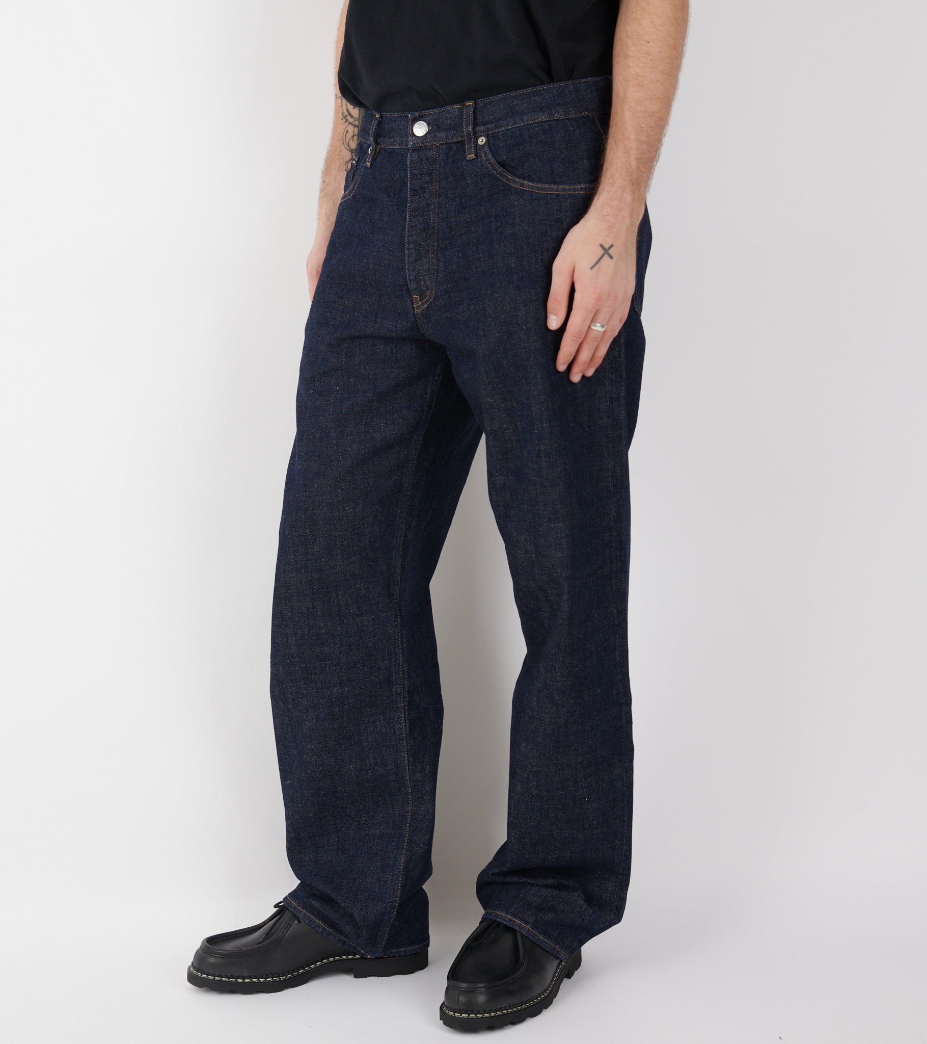 Mørke denim jeans fra Sunflower. Loose Jeans har bæltestropper, tre skrålommer på fronten og to baglommer. Øverst bagpå er et sort logotag i læder. De er unisex og har en let afslappet pasform.