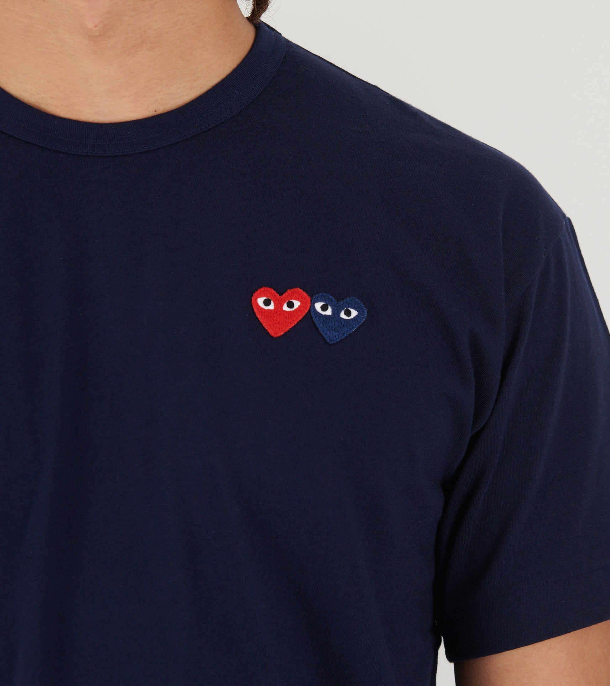 Navy unisex t-shirt fra Comme des Garcons PLAY med mærkets karakteristiske hjerte med øjne. Det ikoniske hjerte med øjnene fra PLAY er designet af Filip Pagowski og er gennemgående på alle PLAY produkter. Denne t-shirt har to små broderede hjerter ved venstre bryst.