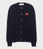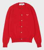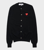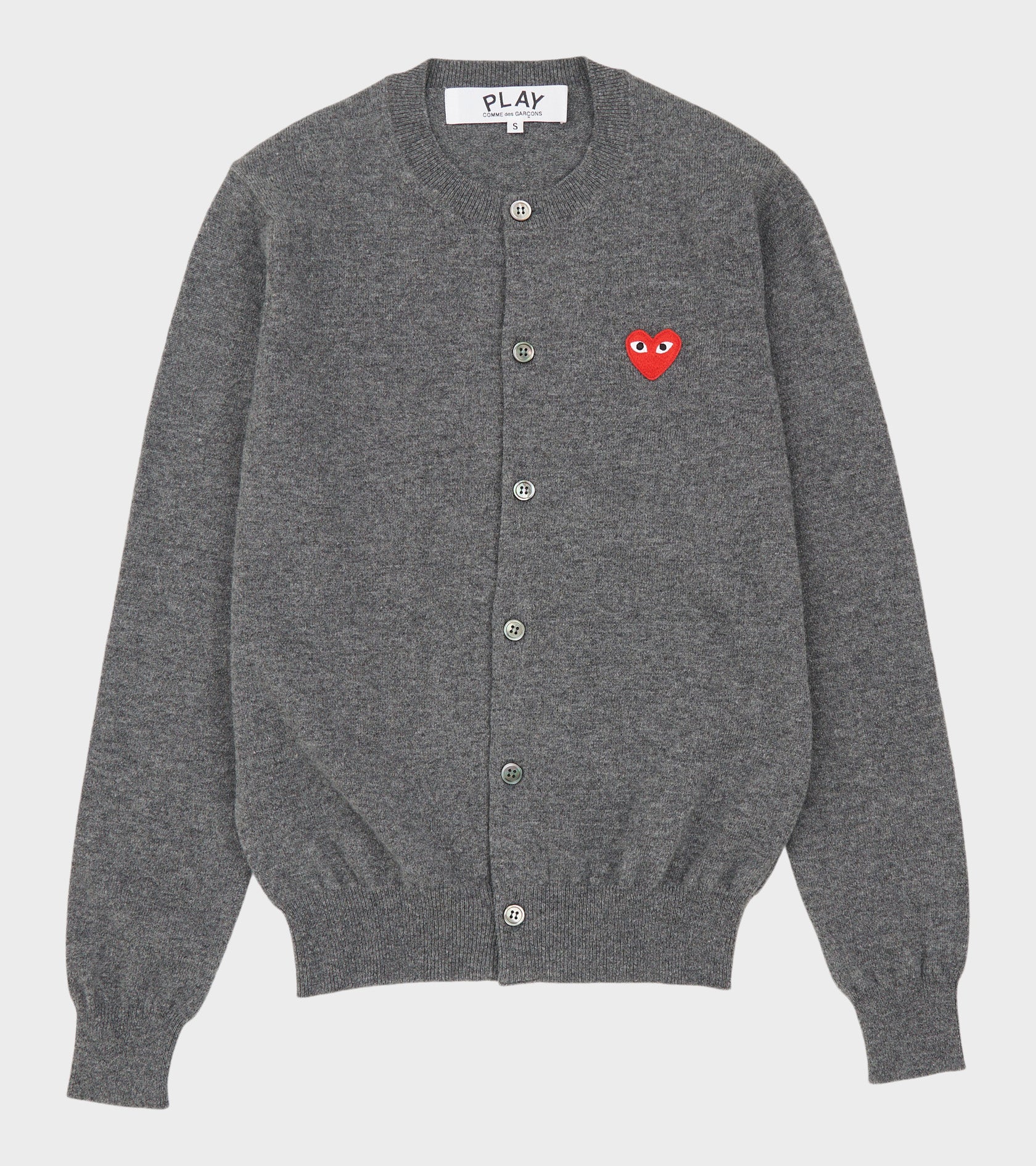 Grå unisex cardigan i uld fra Comme des Garcons PLAY. Denne cardigan har en rund hals, ribstrikkede kanter og en knaplukning med perlemorsknapper. Ved venstre bryst er det røde PLAY-hjerte broderet. Det ikoniske hjerte med øjnene fra PLAY er designet af Filip Pagowski og er gennemgående på alle PLAY produkter.