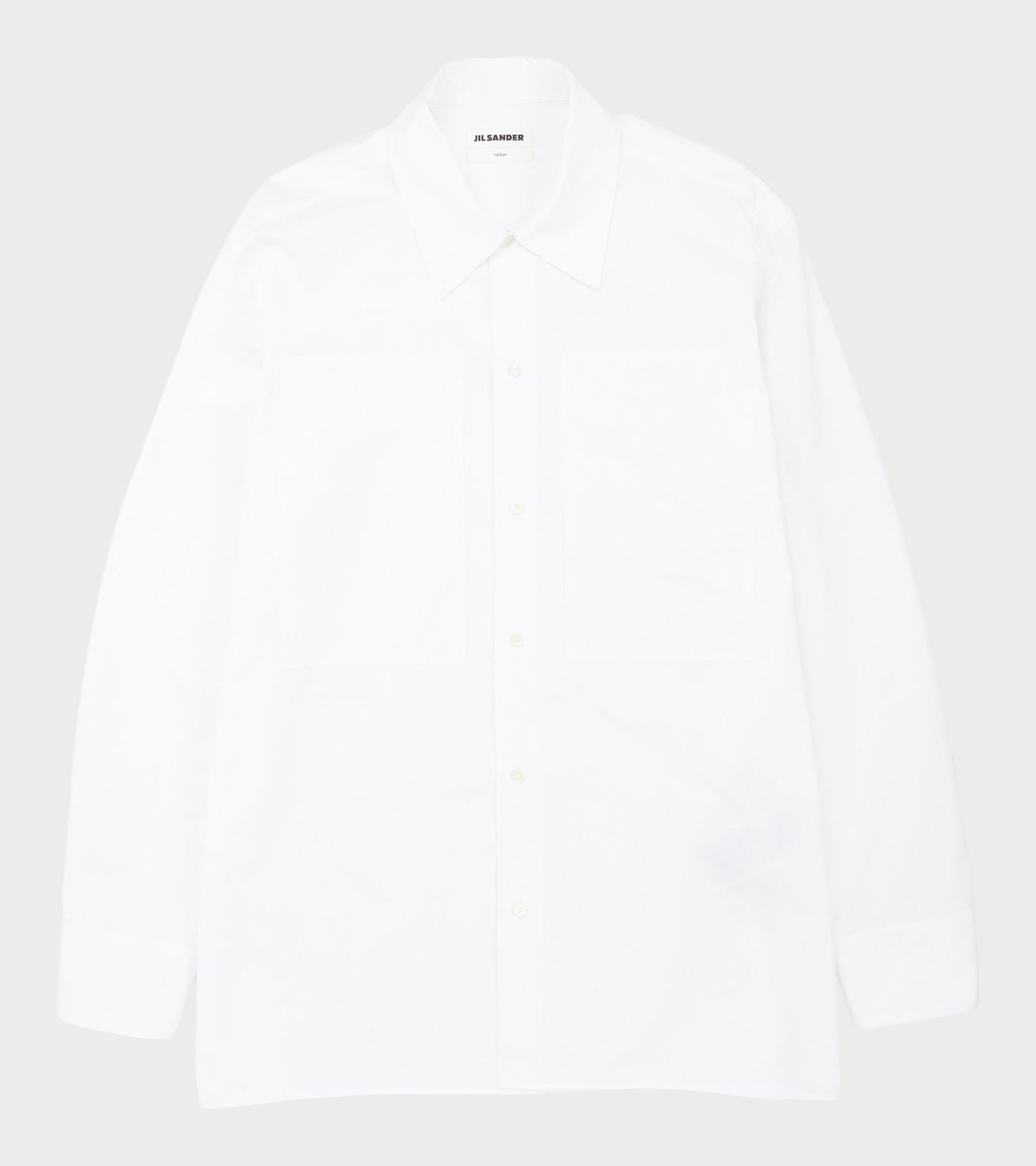Klassisk hvid skjorte fra Jil Sander. Denne skjorte er fremstillet i bomuldspoplin og har en klassisk krave, en knaplukning og to patch detaljer på fronten. Nederst på fronten er et lille 'JS' logo broderet i hvid. Skjorten er produceret i Italien og har en let afslappet pasform.