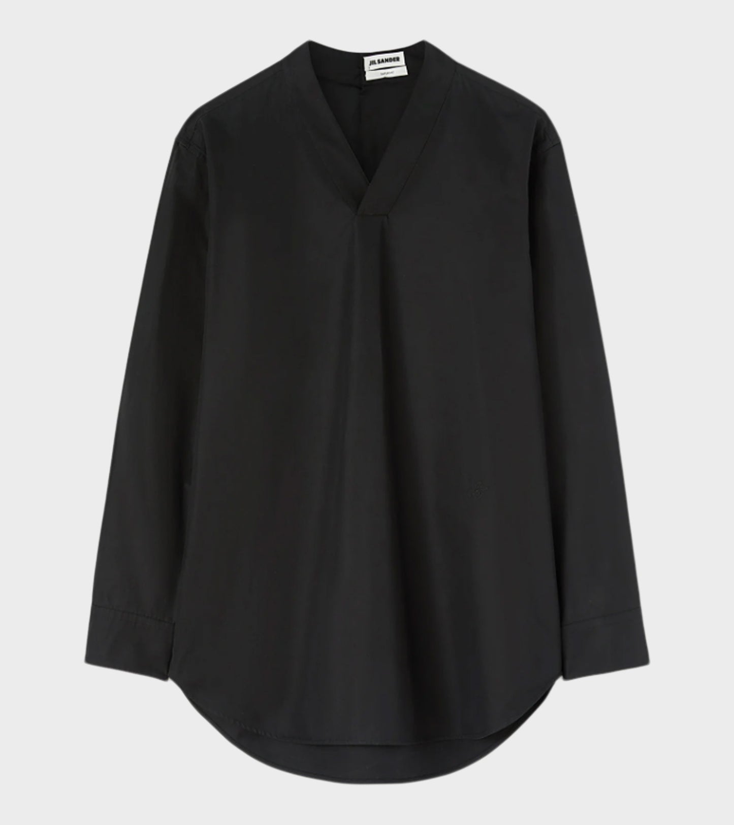 Sort skjorte i økologisk bomuldspoplin fra Jil Sander. Denne skjorte har en v-udskæring, en rund slids i hver side samt en knapdetalje øverst bagpå. På fronten i venstre side er et diskret broderet 'JS' logo i sort. Skjorten er produceret i Italien og har en afslappet pasform.