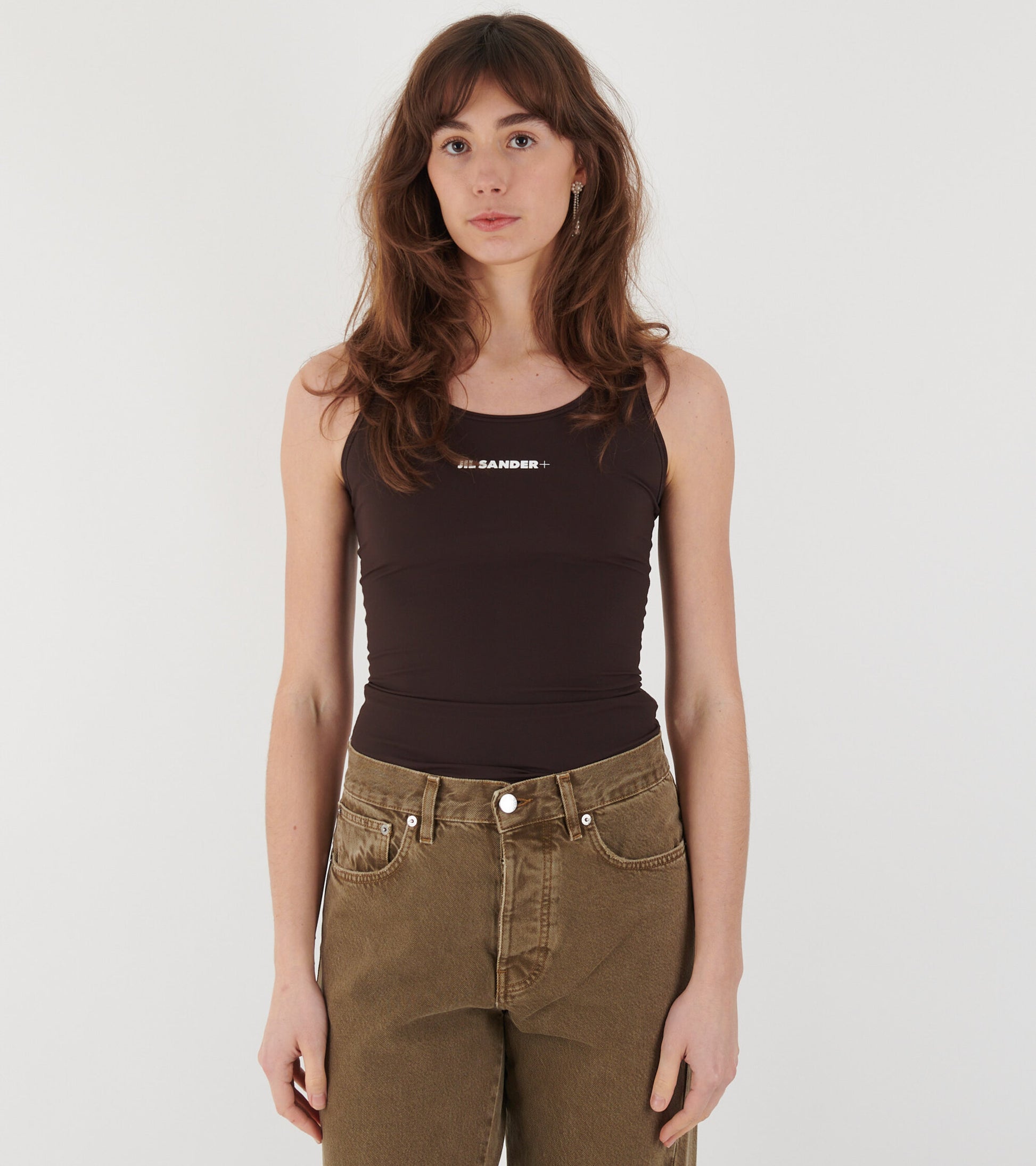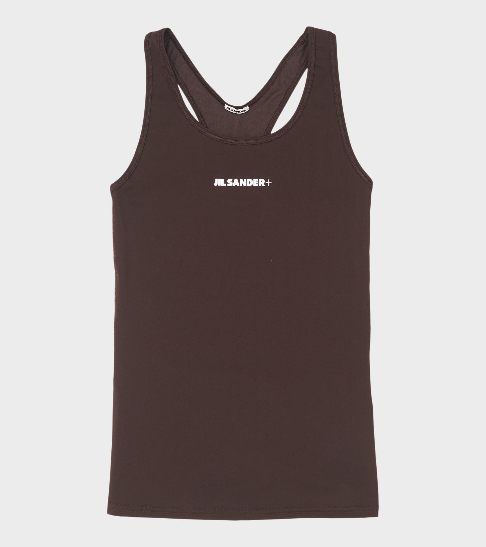 Brun top fra Jil Sander. Denne top er fremstillet i en strækbar nylonkvalitet og har et hvidt printet logo på fronten. Den er produceret i Italien og har en let tætsiddende pasform.