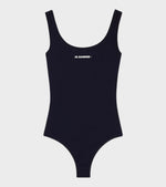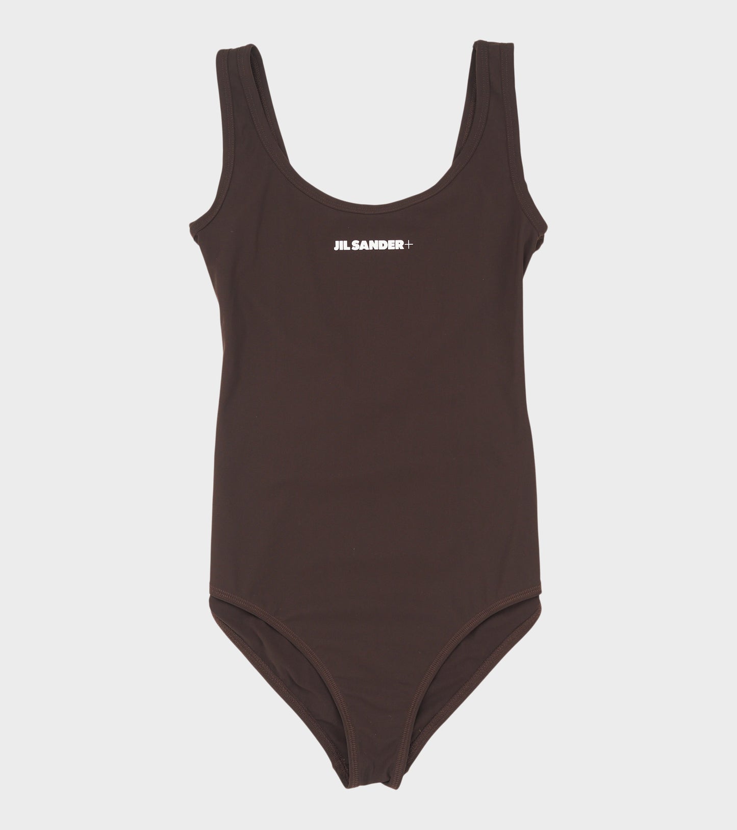 Brun badedragt fra Jil Sander. Denne badedragt har et logo printet på fronten og en dyb rund udskæring bagpå ryggen. Dustbag medfølger.