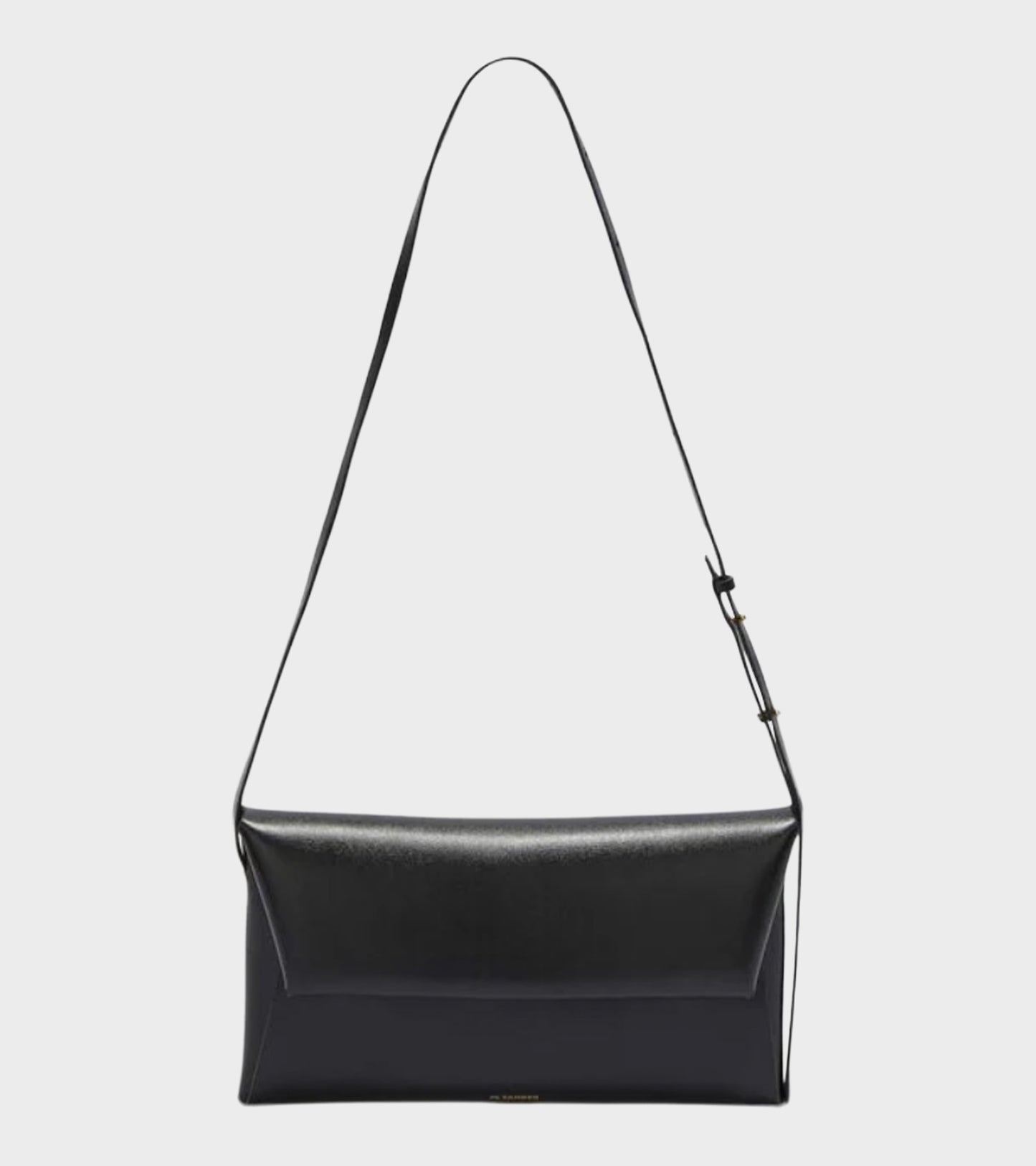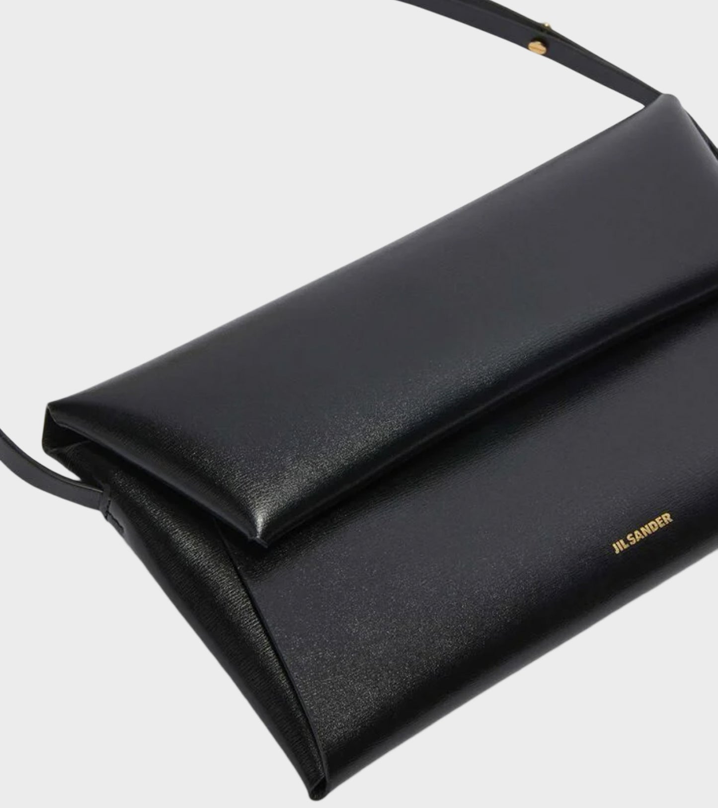 Sort taske i glat kalveskind fra Jil Sander. Folded Small Crossbody Bag har en flap-lukning med magnetiske knapper, ét stort indvendigt rum samt små lommer til kort. Tasken har en justerbar skulderrem og et lille logo printet i guld på fronten. Den er produceret i Italien og kommer med en dustbag.