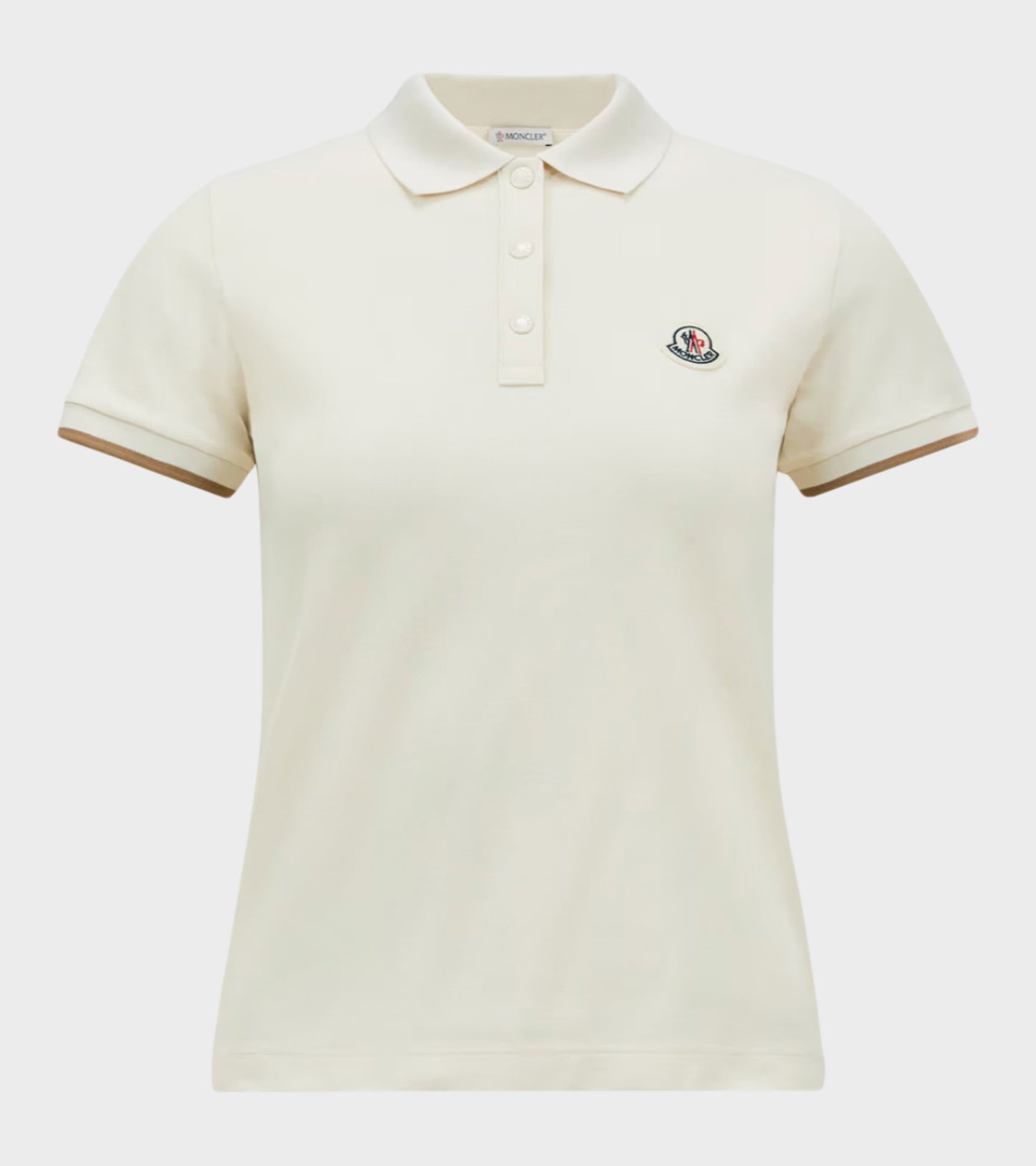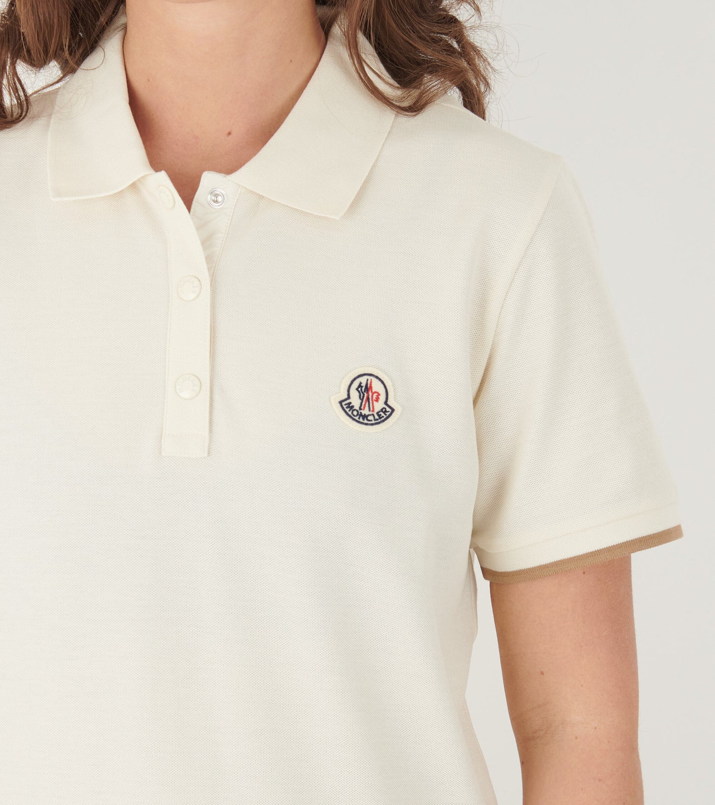 Råhvid kortærmet polo fra Moncler. Denne polo er fremstillet i bomuldspiqué og har en klassisk polokrave, en logo-trykknaplukning og lysebrune kontrastdetaljer ved ærmerne. Ved venstre bryst er det ikoniske logo i filt.