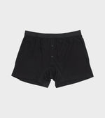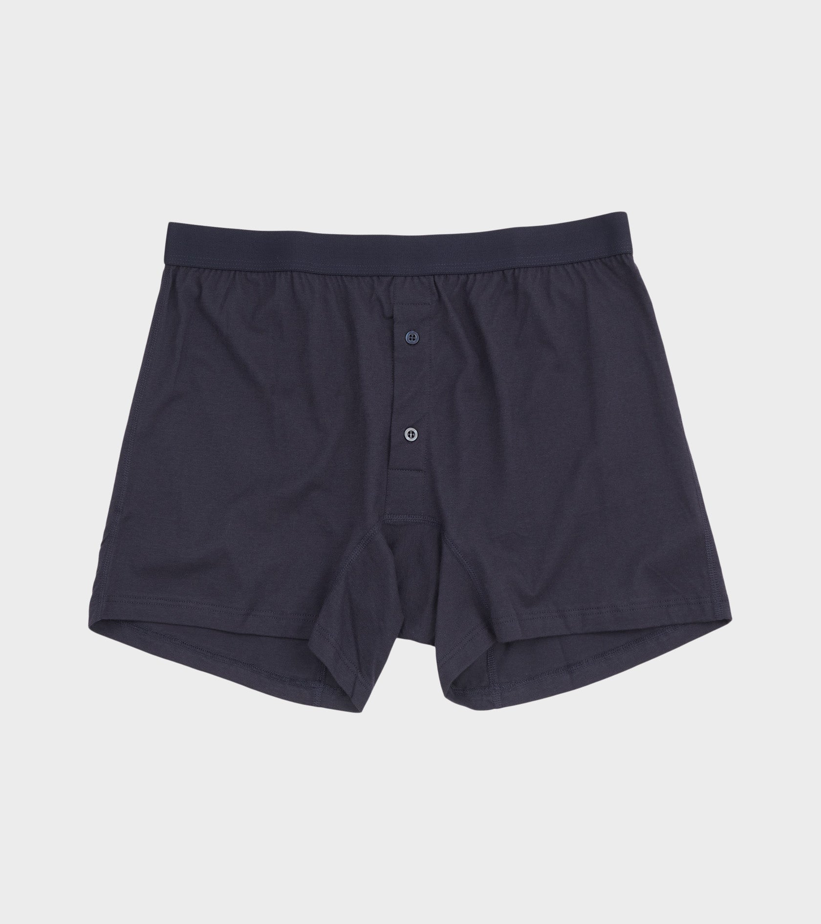 Navy boxershorts fra Comme des Garcons Shirt. Disse boxershorts har elastik i livet og en knaplukning med to knapper foran. De er produceret i Portugal.