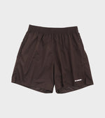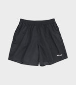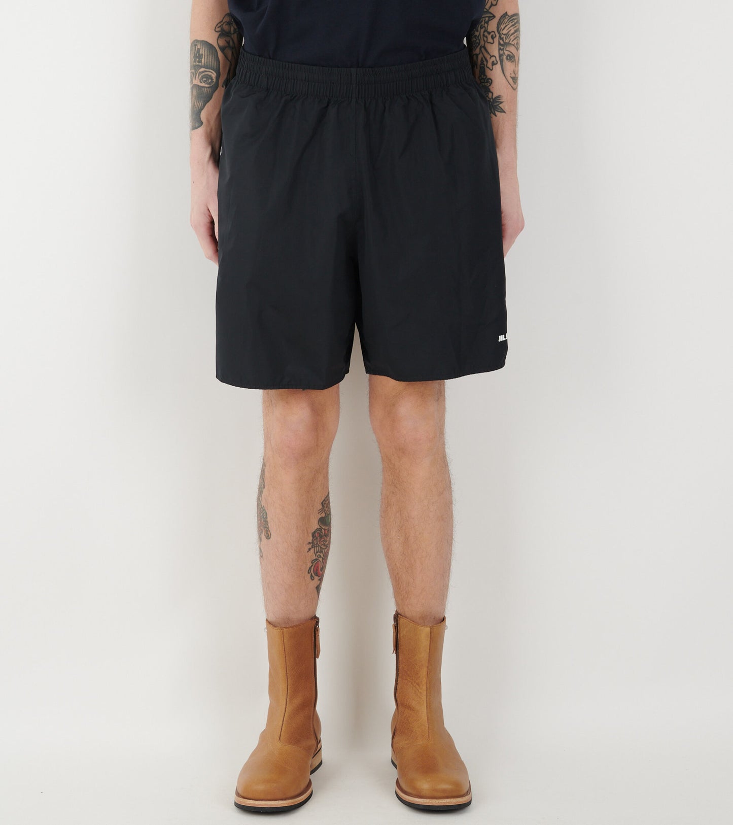 Sorte shorts i polyester fra Jil Sander. Disse shorts er produceret i Italien og har et indvendigt bindebånd samt en diskret lynlåslomme og en slids i hver side. På venstre ben er et printet logo.