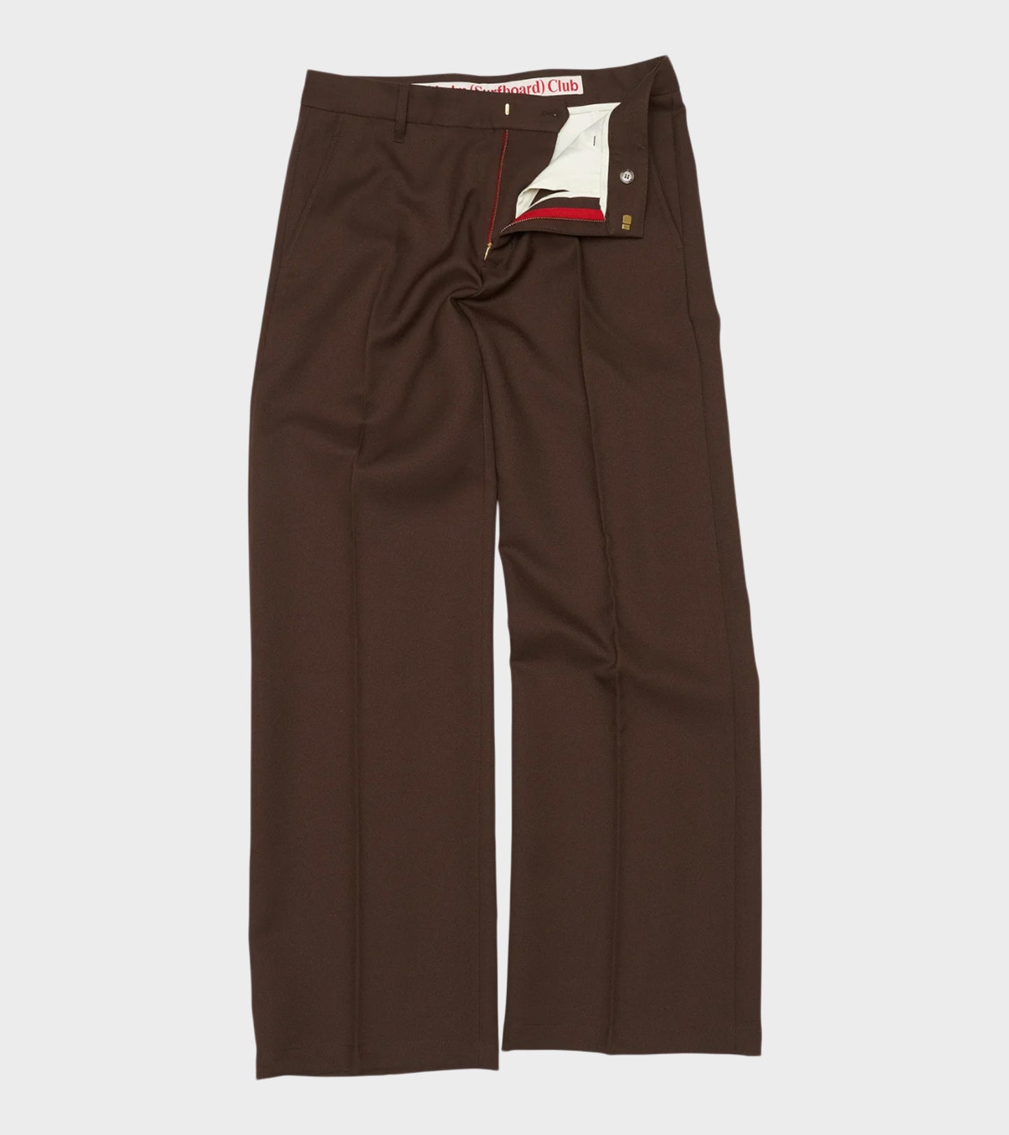Brune bukser fra Stockholm (Surfboard) Club. Sune Tailored Bootcut Trousers har bæltestropper, pressefolder og en skrålomme i hver side. Bagpå er to stiklommer samt et lille logotag.