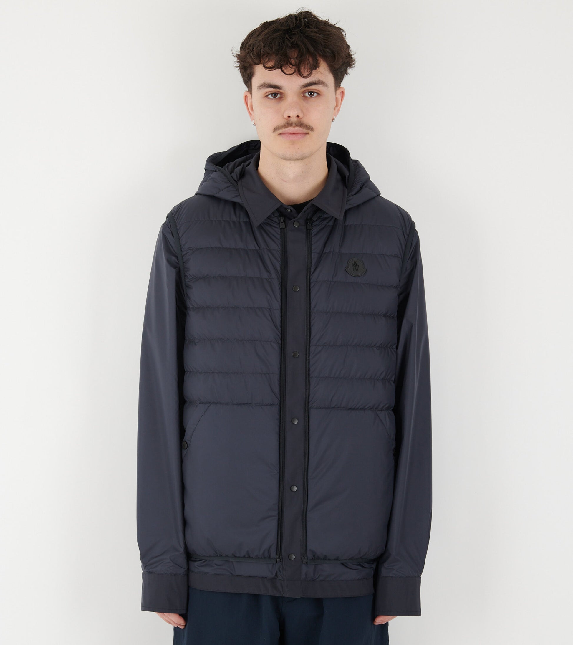 Navy jakke fra Moncler. Denne jakke er vendbar og har en trykknaplukning, en klassisk krave og fire lommer på fronten. Jakken kommer med en dunvest, som kan lynes af og bruges seperat. Vesten har en hætte og er foret med bløde dun og fjer. Både vesten og jakken har det ikoniske logo i sort. Charve Reversible Vest Jacket er produceret i Italien.