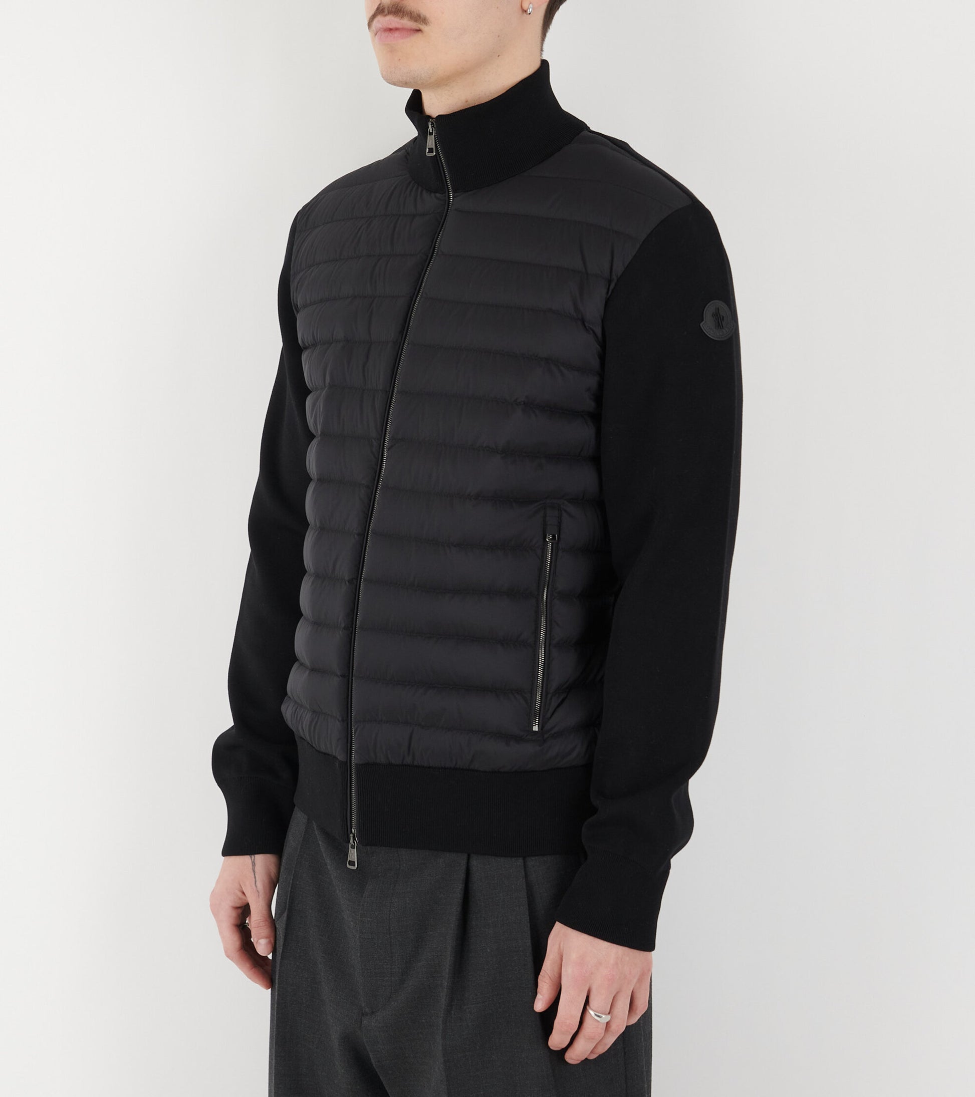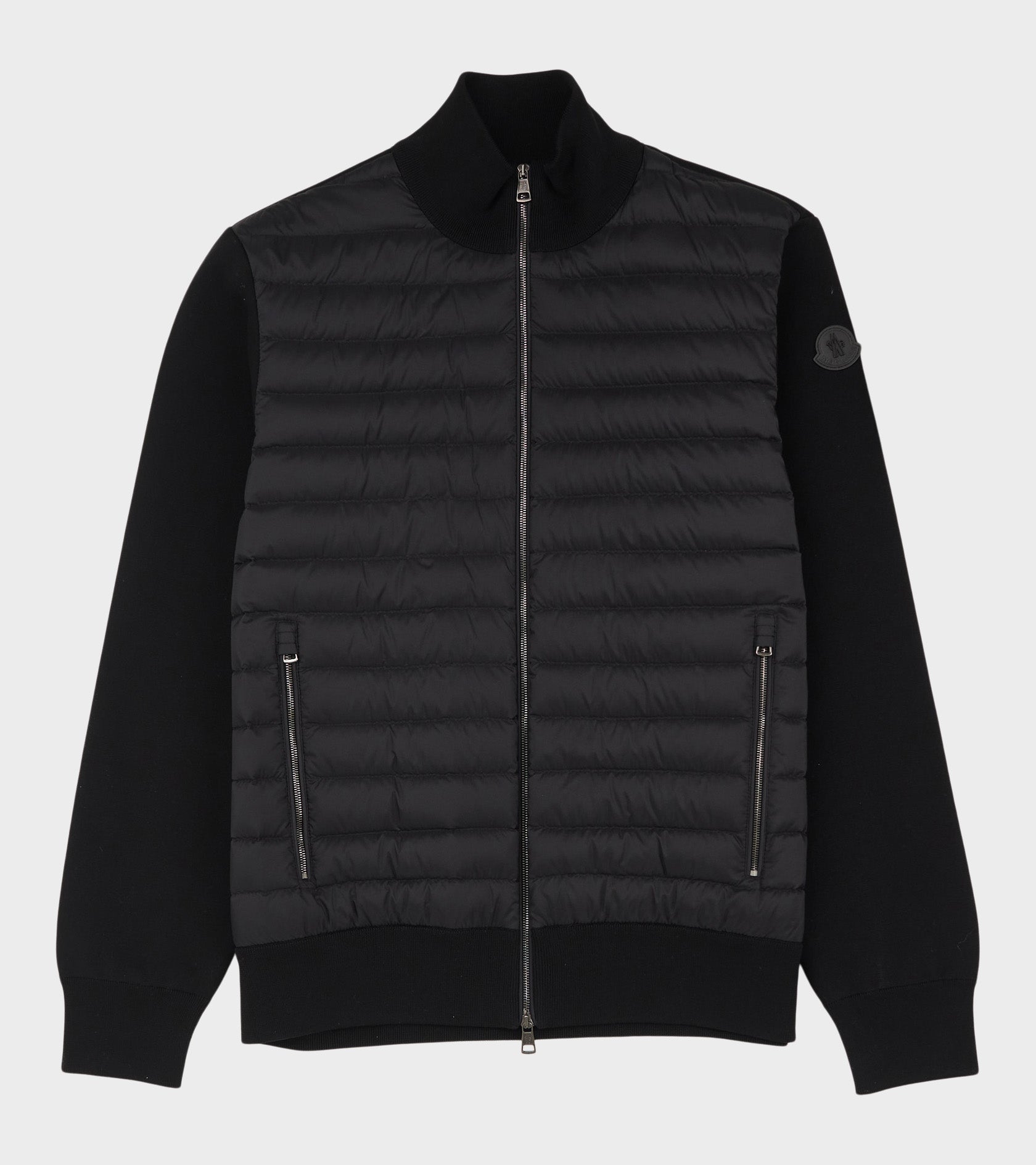 Sort jakke fra Moncler. Denne jakke er fremstillet i en blanding af bomuldsgarn og nylon. Fronten er i nylon og er foret med bløde dun og fjer. Jakken har en høj hals, en dobbeltgående lynlåslukning og en lynlåslomme i hver side. På venstre ærme er det ikoniske logo i sort læder.