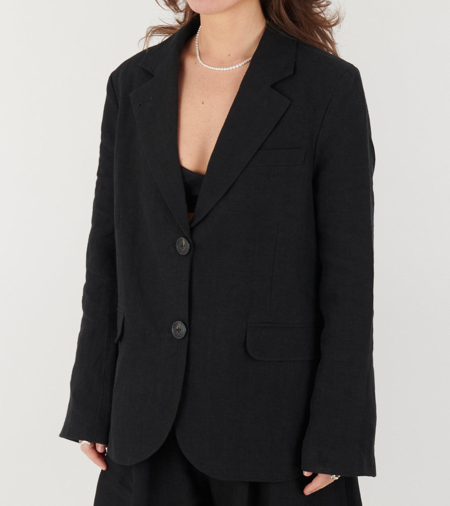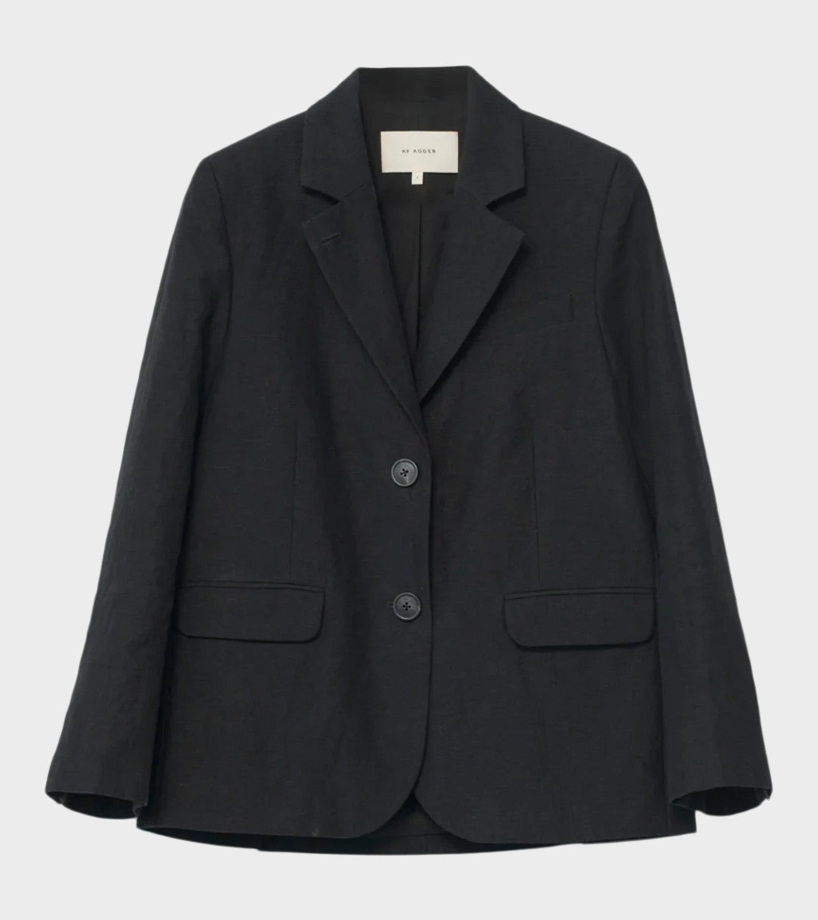 Sort blazer i hør fra AF Agger. Linen Straight Blazer har en klassisk blazer-krave, tre lommer på fronten, en dobbelt slids bagpå samt manchetknapper. Blazeren har to hornknapper på fronten samt én øverst, så den kan lukkes helt med stående krave.