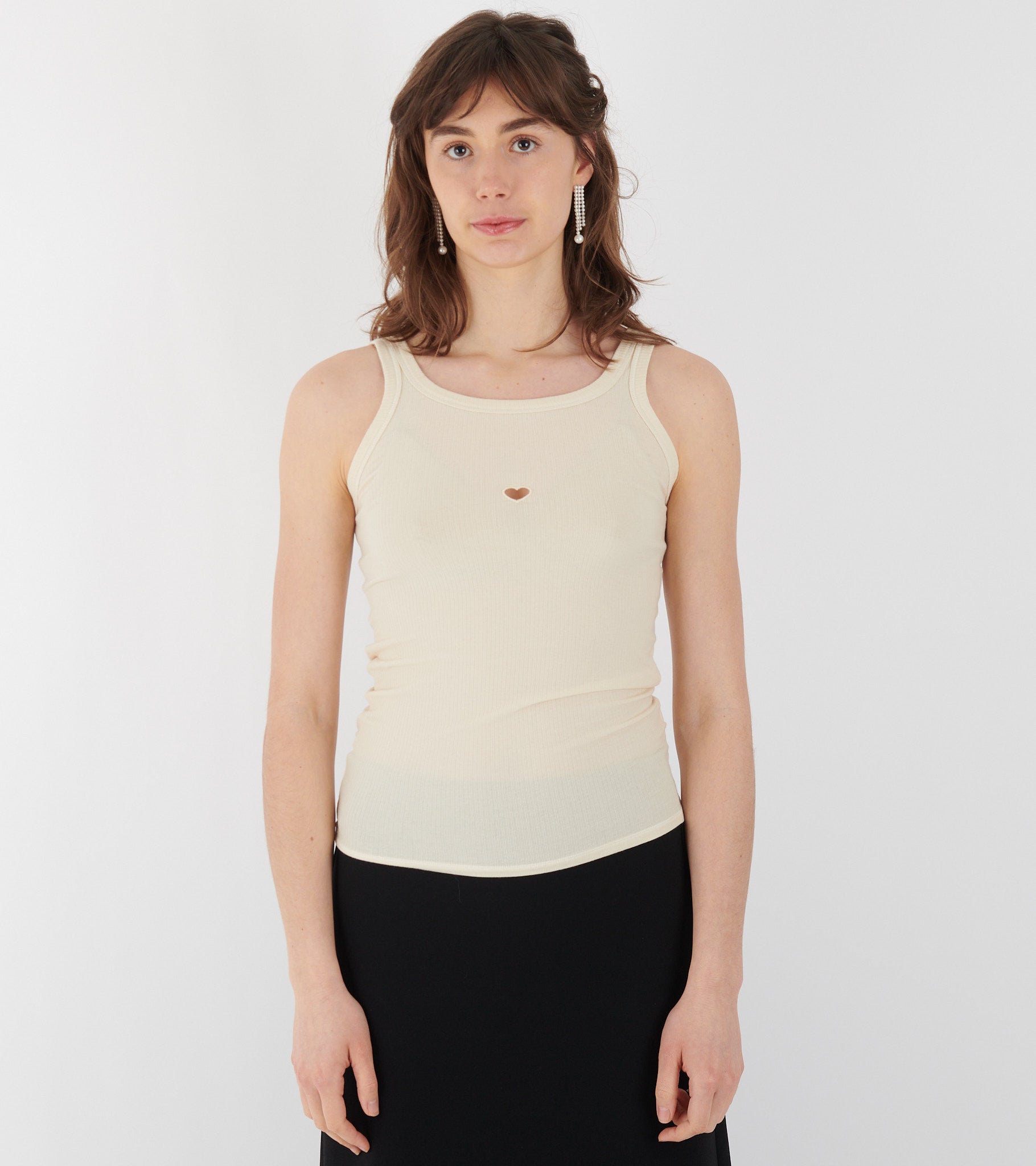 Råhvid rib top fra Baserange. Denne top har brede stropper og et hjerteformet cut-out på fronten. Toppen er produceret i Portugal og er fremstillet i en strækbar økologisk bomuldsblanding. Pasformen er tætsiddende.